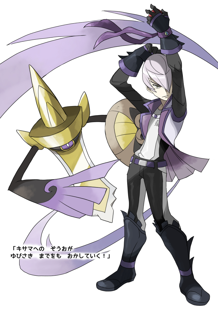 1boy aegislash belt black_pants boots crossover full_body gen_6_pokemon green_eyes grey_hair hair_over_one_eye holding holding_poke_ball ishida_mitsunari_(sengoku_basara) janis_(hainegom) jinbaori light_frown looking_at_viewer male_focus mega_stone nintendo pants parody poke_ball pokemon purple_belt sengoku_basara short_hair simple_background solo standing style_parody translation_request white_background