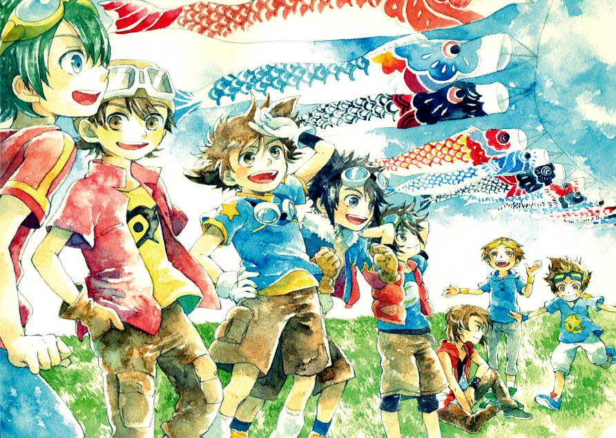 6+boys akashi_tagiru appmon black_eyes black_hair blue_eyes brown_eyes brown_hair daimon_masaru_(digimon_savers) digimon digimon_adventure digimon_adventure_02 digimon_frontier digimon_savers digimon_tamers digimon_universe:_appli_monsters digimon_xros_wars digimon_xros_wars:_toki_wo_kakeru_shounen_hunter-tachi gloves goggles grass green_hair hat kanbara_takuya kudou_taiki male_focus matsuda_takato motomiya_daisuke multiple_boys outdoors pants shinkai_haru shirt shoes shorts smile socks vest wristband yagami_taichi