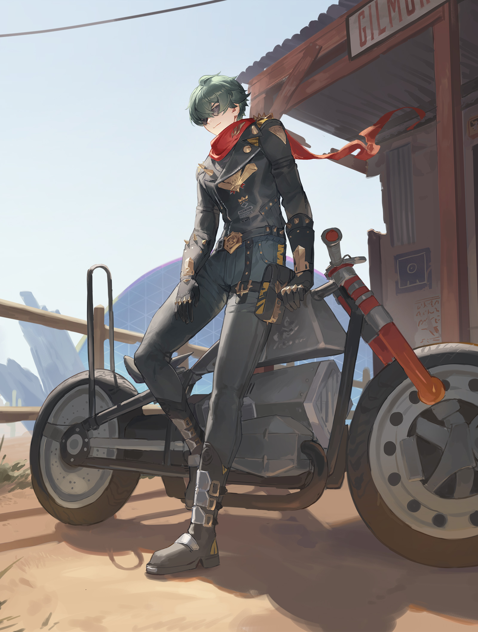 1boy biker_clothes black_gloves black_jacket black_pants commentary cotta_(heleif) full_body gloves green_eyes green_hair highres jacket leather leather_jacket lighter_(zenless_zone_zero) looking_at_viewer male_focus motor_vehicle motorcycle outdoors pants red_scarf scarf short_hair shoulder_spikes smile solo spiked_jacket spikes studded_gloves sunglasses zenless_zone_zero