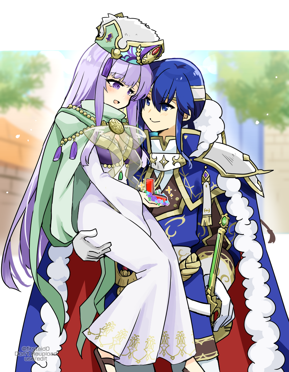 1boy 1girl blue_eyes blue_hair blunt_bangs breasts brother_and_sister cape circlet cleavage dress fire_emblem fire_emblem:_genealogy_of_the_holy_war fur_trim green_cape hat headband highres holding jewelry julia_(fire_emblem) julia_(scion)_(fire_emblem) lifting_person long_hair medium_breasts nintendo official_alternate_costume open_mouth outdoors purple_eyes purple_hair ring sandals seliph_(fire_emblem) seliph_(scion_of_light)_(fire_emblem) siblings smile tyrfing_(fire_emblem) very_long_hair white_headband yukia_(firstaid0)