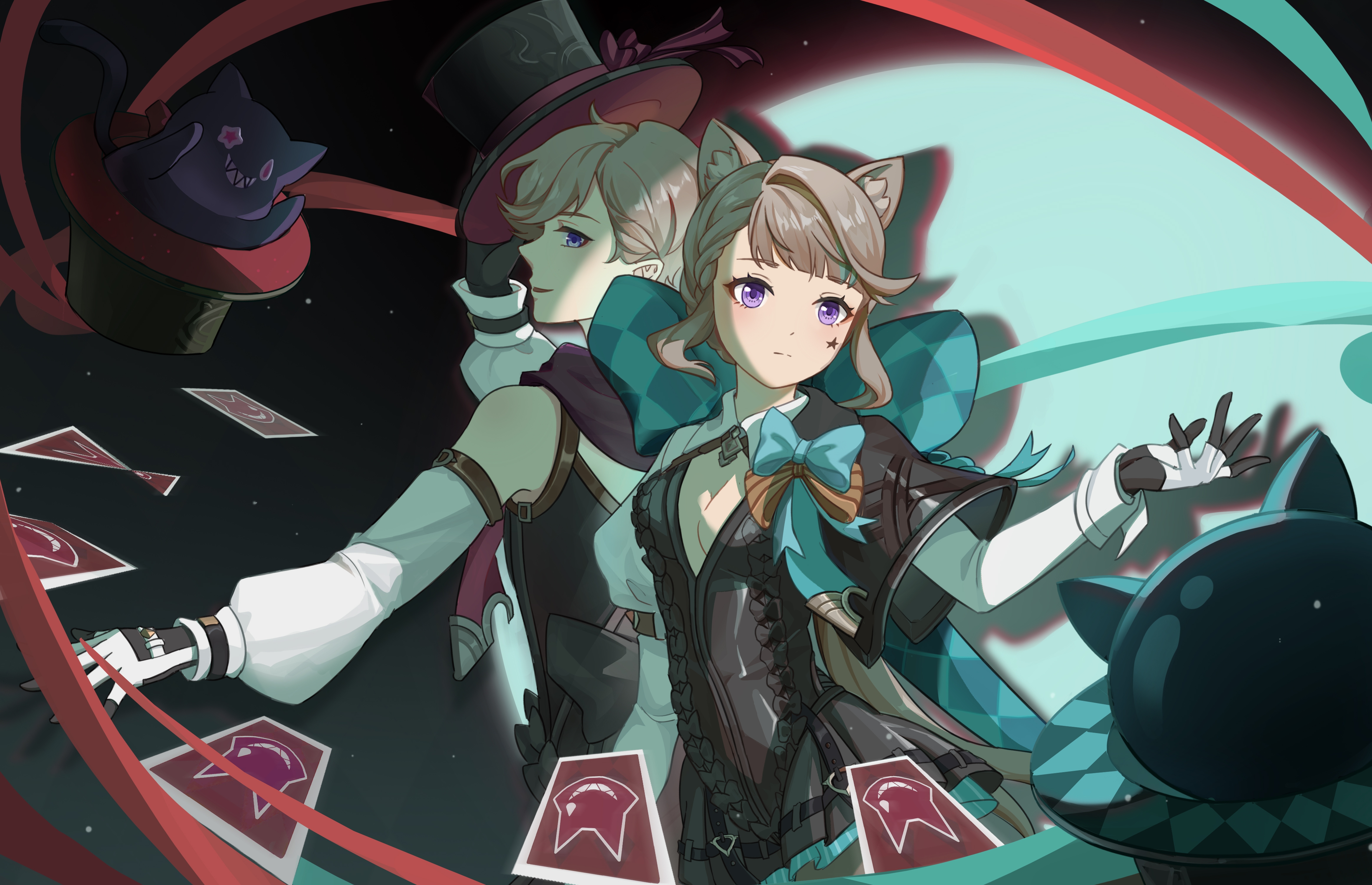 1boy 1girl absurdres animal_ears aqua_bow black_gloves black_leotard bow breasts brown_bow brown_hair card cat cat_ears dress facial_mark genshin_impact gloves hat highres leotard looking_at_viewer lynette_(genshin_impact) lyney_(genshin_impact) playing_card purple_eyes rosseland_(genshin_impact) short_hair siblings star_(symbol) star_facial_mark top_hat white_gloves xiayouhouniao