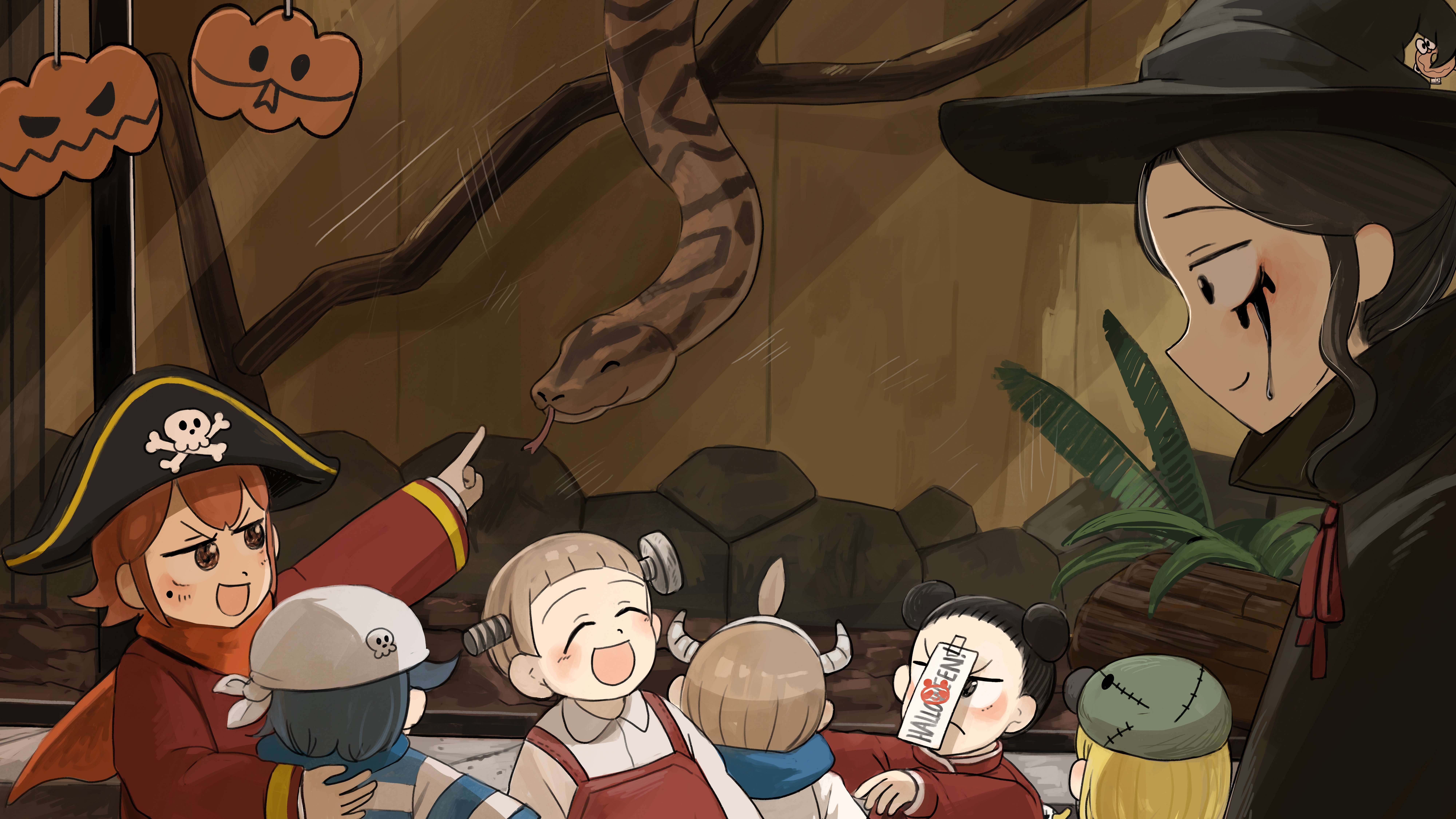 6+girls :d absurdres bird black_hair black_hat blonde_hair blue_hair blue_shirt bob_cut_twin_(diva) commentary constricted_pupils diva_(hyxpk) donut_stamp double_bun duck english_commentary frown hair_bun halloween halloween_costume hat highres lion_shirt_boy_(diva) makeup multiple_girls object_through_head ofuda ofuda_on_head open_mouth orange_hair overalls penguin_fan_(diva) pirate_hat pointing red_overalls red_shirt runny_makeup screw_in_head shirt short_hair slice_of_life smile snake snake_keeper_(diva) striped_clothes striped_shirt survey_girl_(diva) tongue tongue_out topknot topknot_twin_(diva) two-tone_shirt white_shirt witch_hat zoo zookeeper zookeepers_(diva)