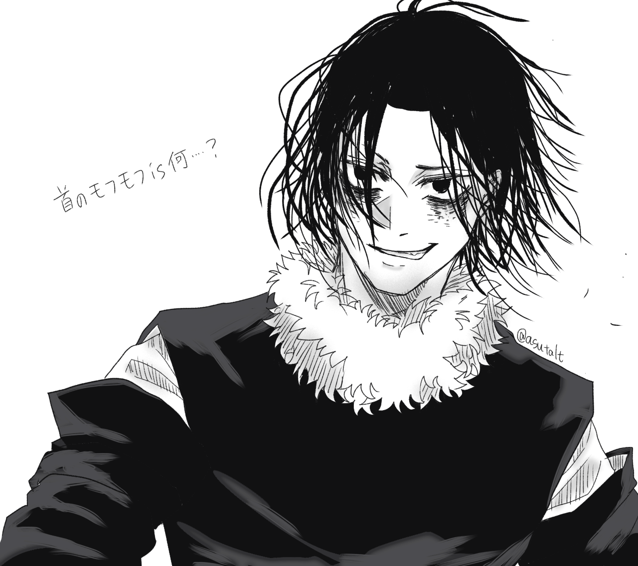 1boy artist_name asutalt bags_under_eyes fur_trim greyscale grin kagurabachi looking_at_viewer male_focus medium_hair messy_hair monochrome simple_background smile soujou_genichi upper_body white_background