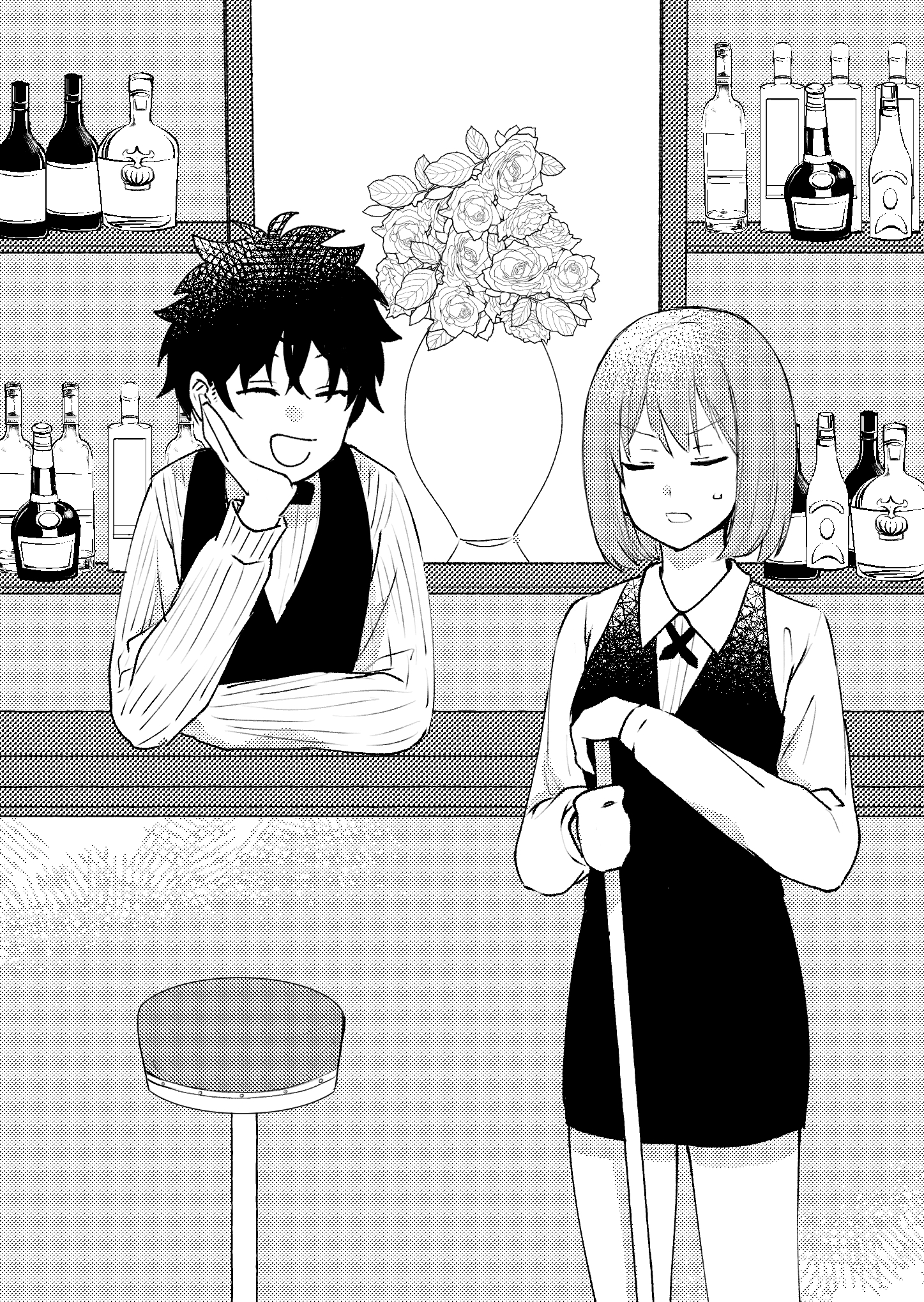 1boy 1girl :d alcohol arato_hisako bottle bow bowtie closed_eyes collared_shirt flower greyscale highres long_sleeves monochrome nakiri_asahi open_mouth shirt shokugeki_no_souma short_hair smile striped_clothes striped_shirt toy-black vase vest