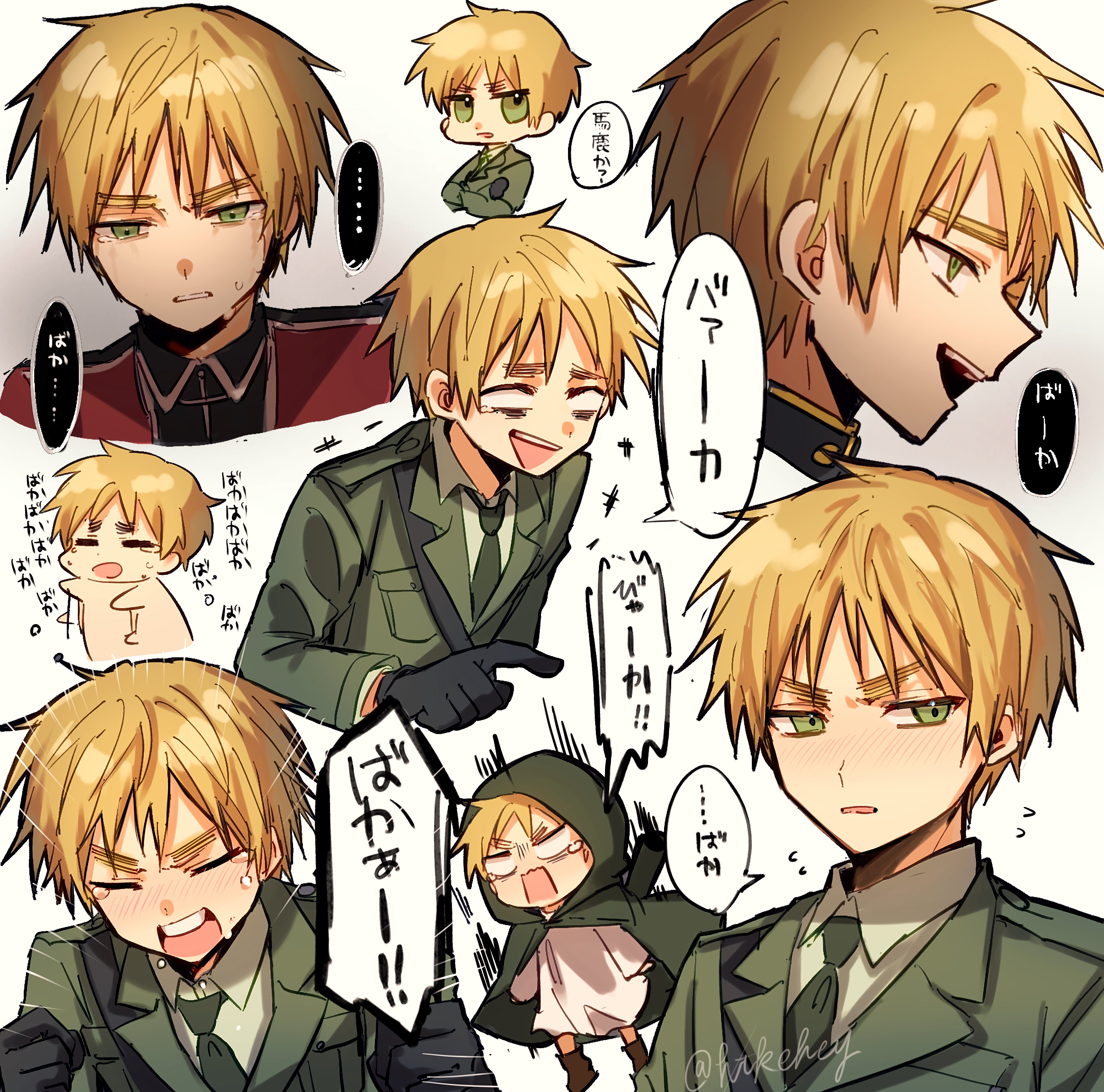 1boy absurdres axis_powers_hetalia black_gloves blonde_hair boots brown_footwear cape clenched_hands closed_eyes collared_jacket collared_shirt crossed_arms crying gloves green_cape green_eyes green_jacket green_necktie hands_up highres hood hooded_cape htkehey jacket lapels laughing looking_afar looking_at_viewer looking_down military_jacket necktie open_mouth pocket red_jacket shirt short_hair simple_background smile speech_bubble tearing_up tears teeth translation_request united_kingdom_(hetalia) upper_body v-shaped_eyebrows white_background white_shirt