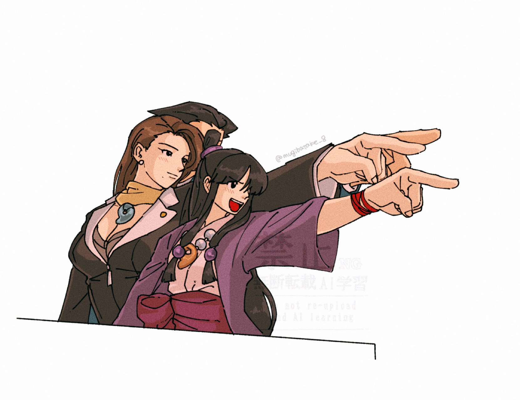 1boy 2girls :d ace_attorney arm_up black_eyes black_hair blunt_bangs brown_hair covered_face hair_bobbles hair_ornament half_updo hanten_(clothes) highres japanese_clothes jewelry kimono long_hair long_sleeves magatama magatama_necklace maya_fey mia_fey mole mole_under_mouth mugibatake multiple_girls necklace open_mouth phoenix_wright pointing pointing_forward scarf siblings simple_background sisters smile sphere_hair_ornament twitter_username white_background yellow_scarf