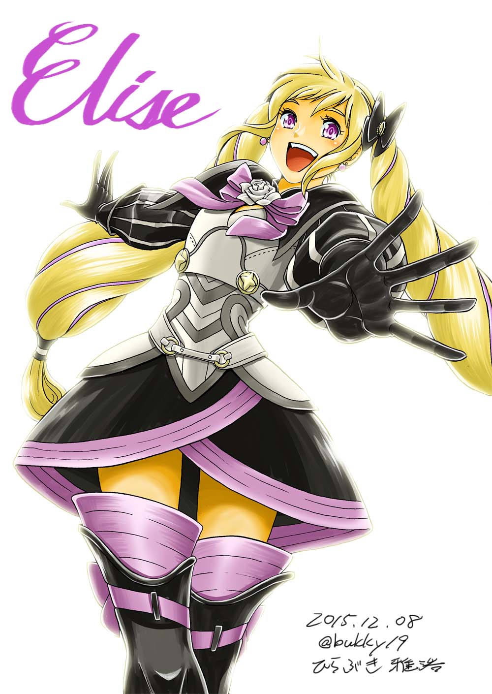 1girl blonde_hair bow drill_hair elise_(fire_emblem) fire_emblem fire_emblem_fates hair_bow highres hirabuki_masahiro long_hair looking_at_viewer multicolored_hair nintendo open_mouth purple_eyes purple_hair smile solo streaked_hair twin_drills twintails
