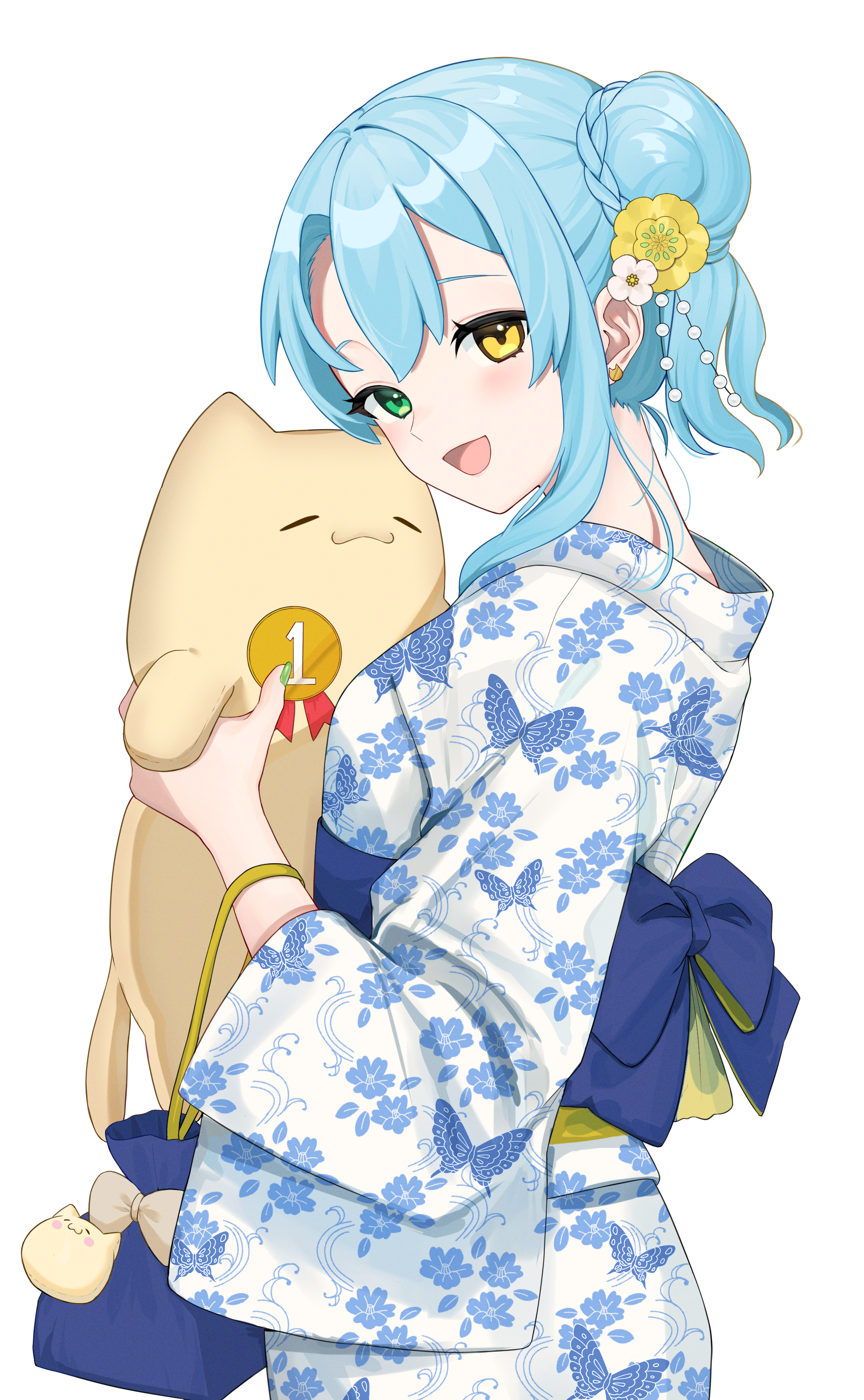 1girl :d absurdres blue_kimono blue_sash braid bun_with_braided_base commission cowboy_shot curtained_hair double-parted_bangs earrings flower from_side green_eyes green_nails hair_bun hair_flower hair_ornament happy heterochromia highres holding holding_stuffed_toy japanese_clothes jewelry kimono kinchaku light_smile long_sleeves looking_at_viewer looking_to_the_side mizukuma_iro nail_polish open_mouth original pouch print_kimono sash second-party_source simple_background smile solo stuffed_toy tachi-e two-tone_kimono white_background white_kimono wide_sleeves yellow_eyes