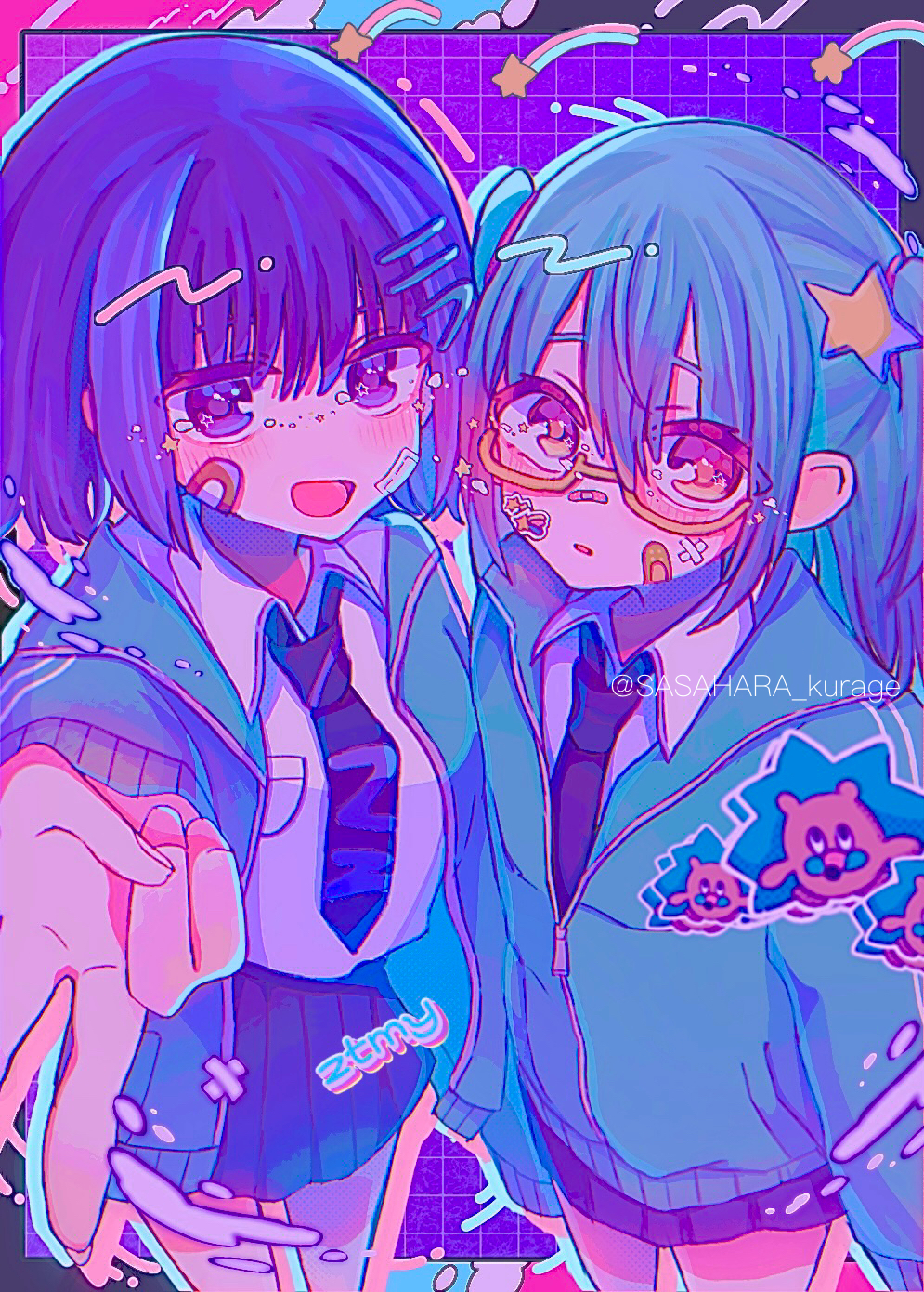2girls :d artist_name bandage_on_face bandages black_necktie black_skirt blue_eyes blue_hair glasses green_hair green_jacket height_difference highres jacket kira_(zutomayo) kira_killer_(zutomayo) looking_at_viewer multicolored_hair multiple_girls necktie nira-chan nira-chan_(kira_killer)_(zutomayo) open_clothes open_jacket open_mouth red_eyes retro_artstyle sasahara_kurage school_uniform shirt skirt smile sticker sticker_on_face two-tone_hair two_side_up v white_shirt yellow-framed_eyewear zutto_mayonaka_de_ii_no_ni
