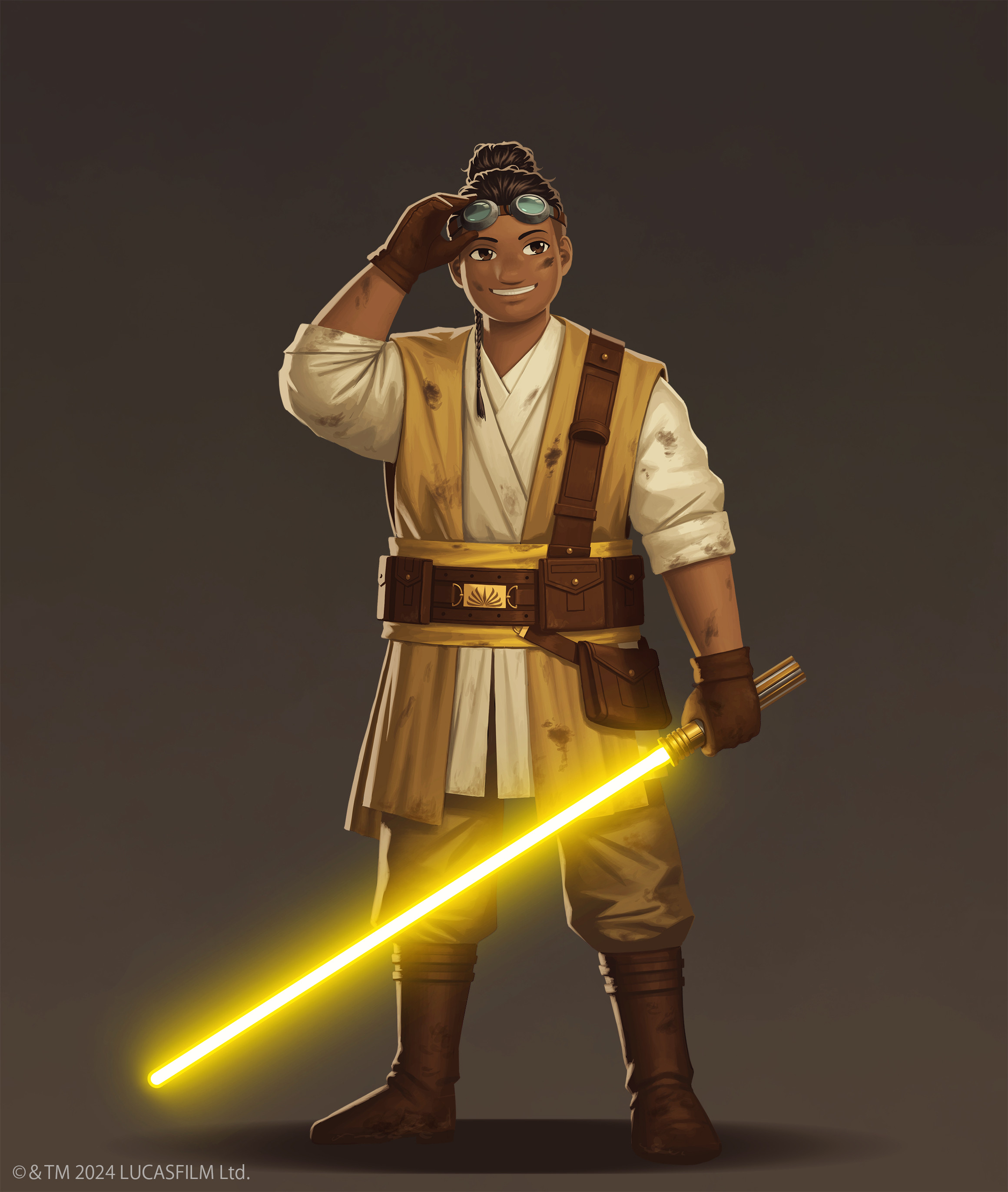 1boy 5health absurdres adjusting_goggles boots brown_background brown_boots brown_eyes brown_gloves brown_hair brown_pants brown_tunic copyright_name dark-skinned_male dark_skin dirty dirty_face energy_sword full_body gloves goggles goggles_on_head grin highres holding holding_sword holding_weapon lightsaber male_focus pants ram_jomaram smile solo standing star_wars star_wars:_the_high_republic sword tunic weapon yellow_lightsaber