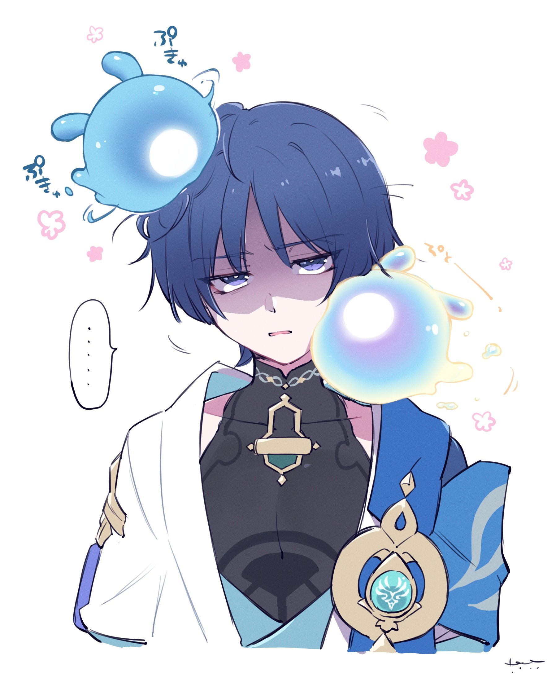 ... 1boy annoyed bishounen black_shirt blue_hair bright_pupils creature cropped_torso dark_blue_hair flower_symbol furrowed_brow genshin_impact happy_aura highres homare_(g_hmr88) layered_clothes male_focus missing_headwear parted_lips purple_eyes scaramouche_(genshin_impact) seelie_(genshin_impact) shaded_face shirt signature simple_background sketch solo sound_effects spoken_ellipsis straight-on unkempt upper_body upturned_eyes vision_(genshin_impact) wanderer_(genshin_impact) white_background white_pupils white_shirt