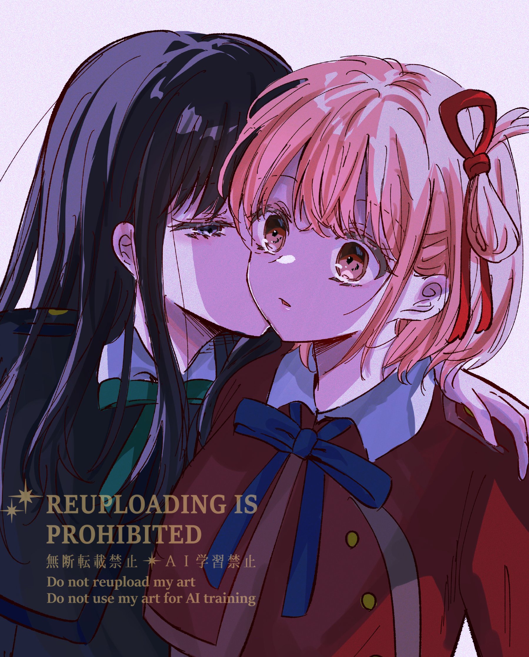 2girls aqua_ribbon black_hair blonde_hair blue_ribbon commentary grey_background hair_ribbon highres inoue_takina kiss kissing_cheek long_hair lycoris_recoil lycoris_uniform multiple_girls neck_ribbon nishikigi_chisato one_side_up purple_eyes red_eyes red_ribbon ribbon short_hair sidelocks simple_background sinkatutiya upper_body watermark yuri