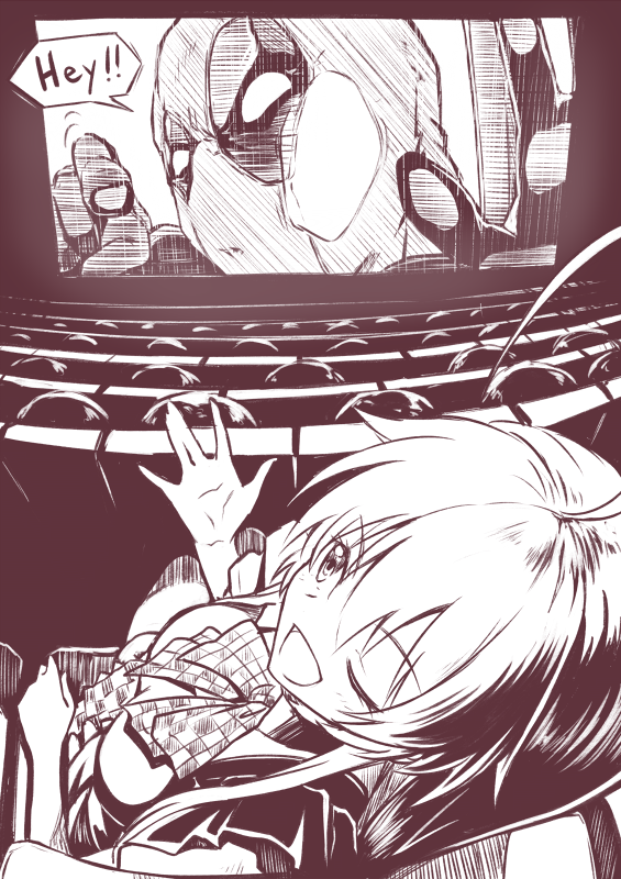 1boy 1girl ;d \||/ ahoge bow bowtie checkered_bow checkered_bowtie checkered_clothes commentary_request crossover deadpool deadpool_(series) english_text from_above greyscale haiyore!_nyaruko-san hand_up huge_ahoge indoors long_hair looking_at_another marvel monochrome movie_theater nyarlathotep_(nyaruko-san) one_eye_closed open_mouth sidelocks sitting smile speech_bubble waving yuto_(dialique)