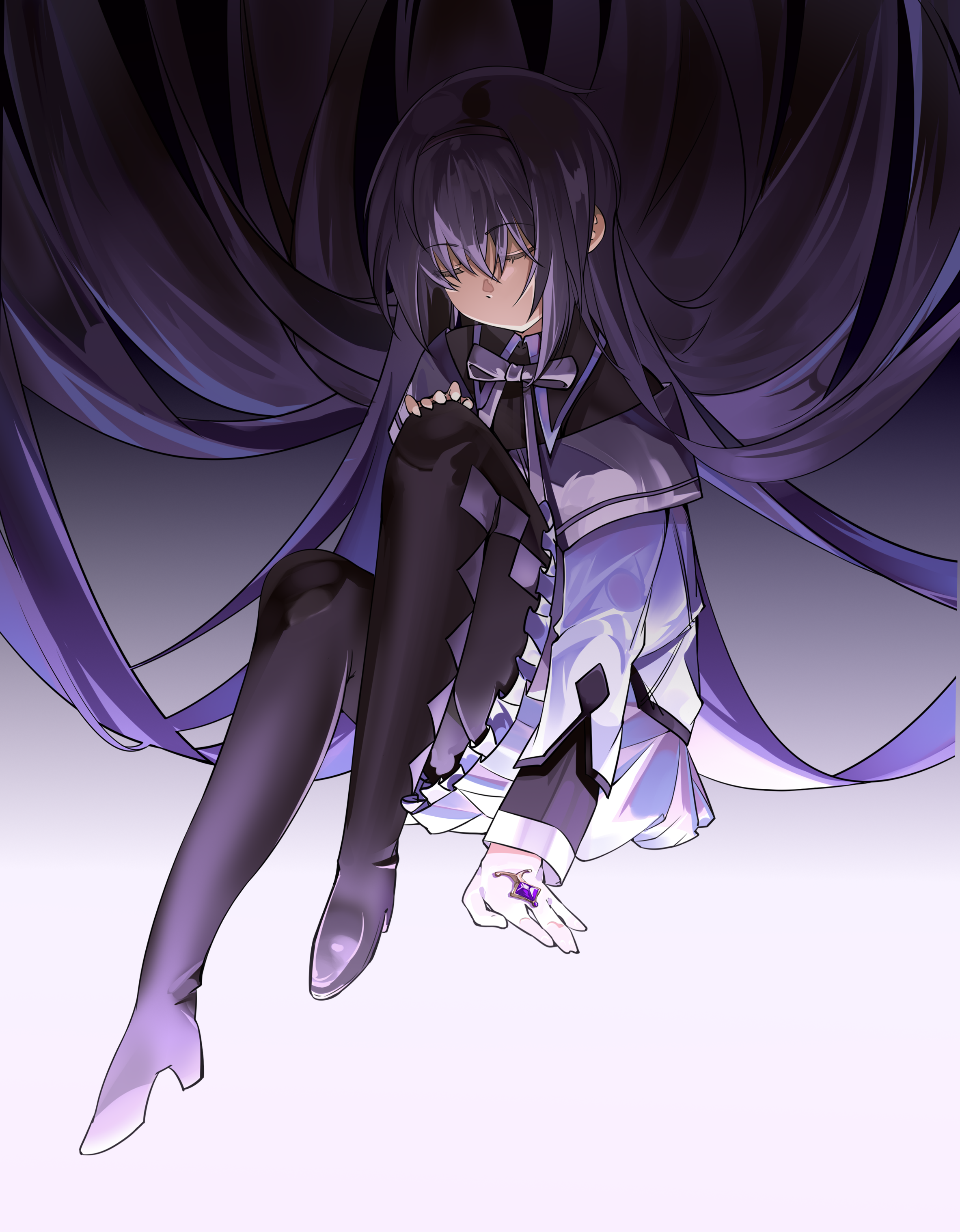1girl absurdly_long_hair absurdres akemi_homura akemi_homura_(magical_girl) argyle_clothes argyle_pantyhose black_hair black_pantyhose chinese_commentary closed_eyes commentary_request hairband hand_on_own_knee highres knees_up kyrimaru2 long_hair long_sleeves magical_girl mahou_shoujo_madoka_magica mahou_shoujo_madoka_magica_(anime) no_mouth pantyhose sitting skirt solo very_long_hair