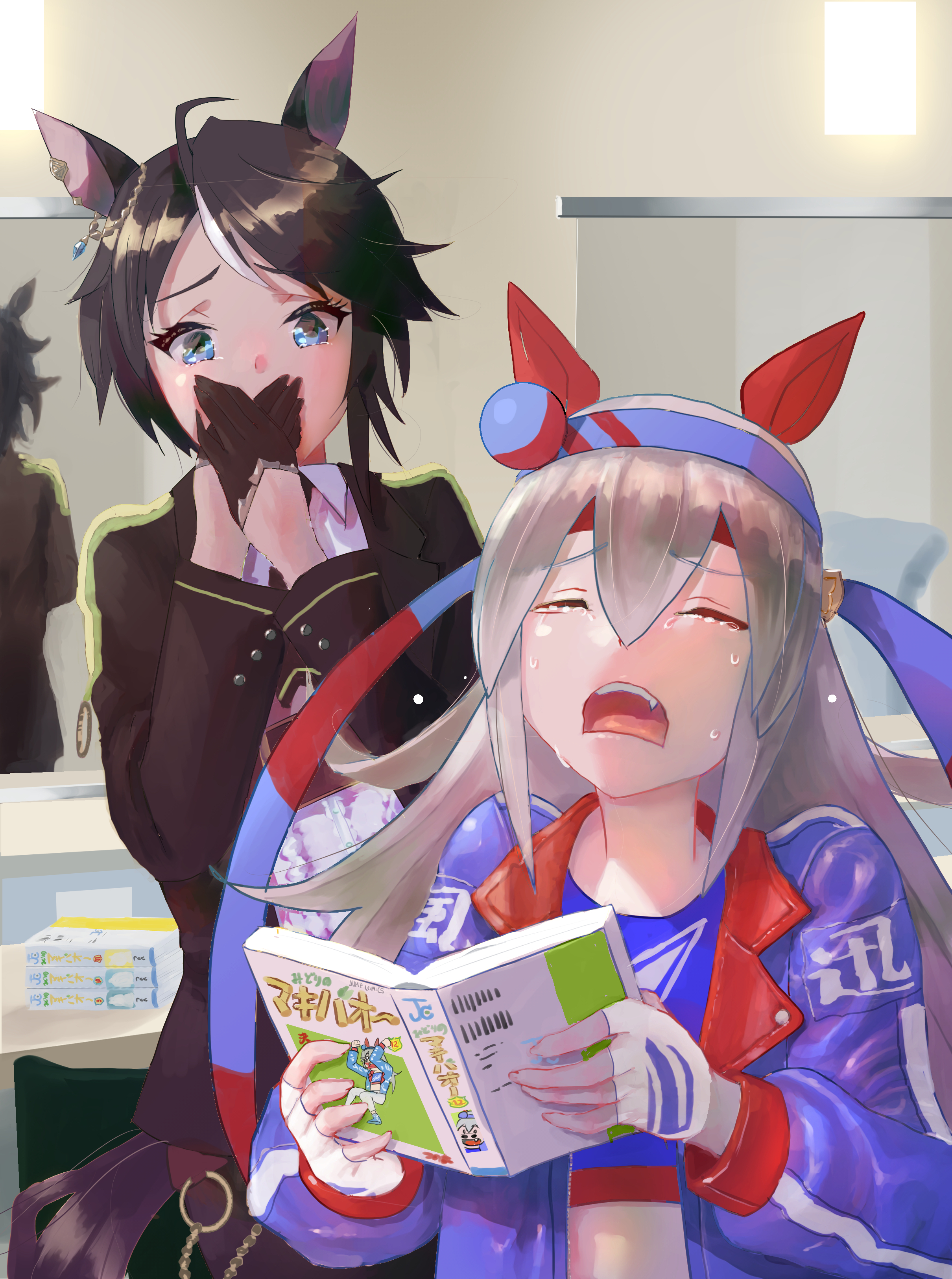 2girls absurdres ahoge animal_ears black_hair blue_eyes blue_jacket commentary crying ear_covers fuji_kiseki_(umamusume) genderswap genderswap_(mtf) grey_hair headband highres horse_ears horse_girl horse_tail jacket long_hair long_sleeves midori_no_makibaoo multiple_girls no_uwazumi open_clothes open_jacket personification short_hair tail tamamo_cross_(umamusume) umamusume shounen_jump