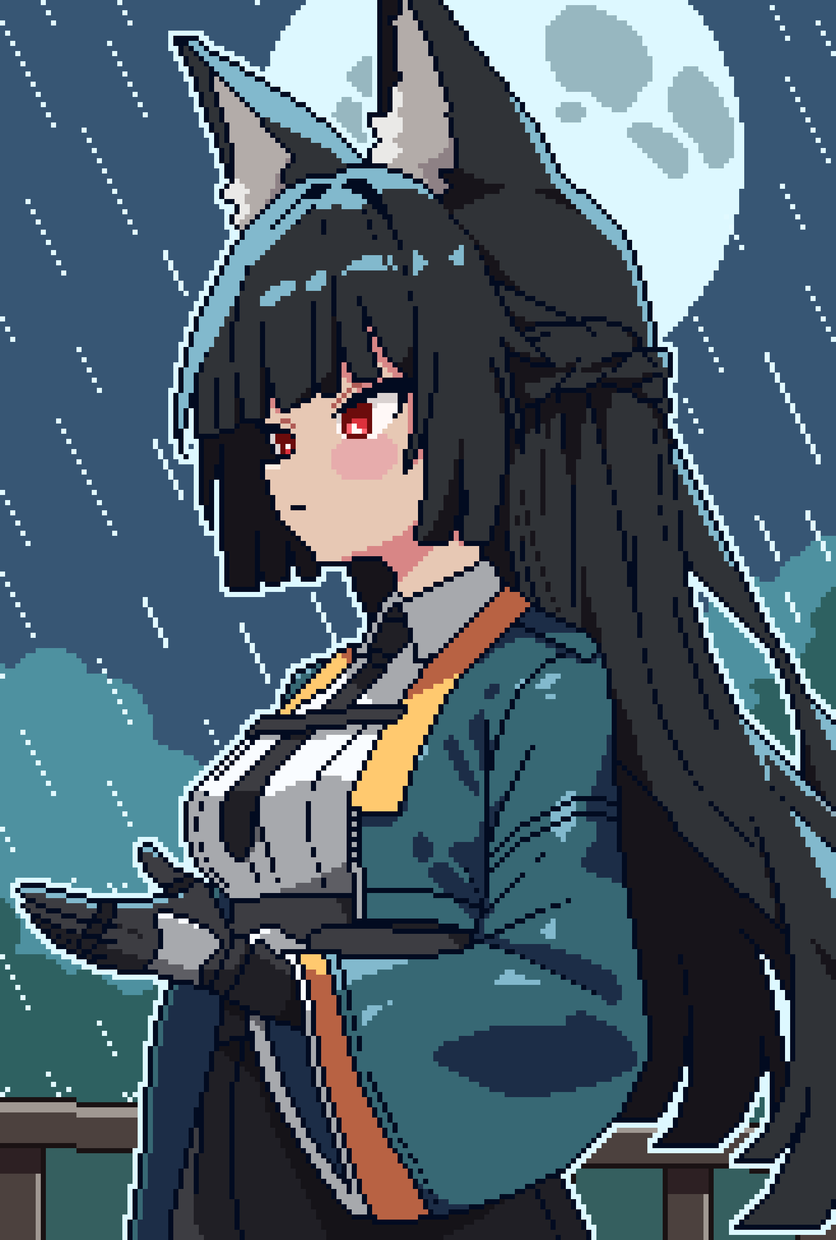 1girl absurdres animal_ear_fluff animal_ears black_gloves black_hair black_necktie blunt_bangs blush closed_mouth dress_shirt fox_ears fox_girl gloves green_jacket high-waist_skirt highres hoshimi_miyabi jacket loblob_art long_hair looking_ahead moon necktie pixel_art rain red_eyes shirt sidelocks skirt solo white_shirt zenless_zone_zero