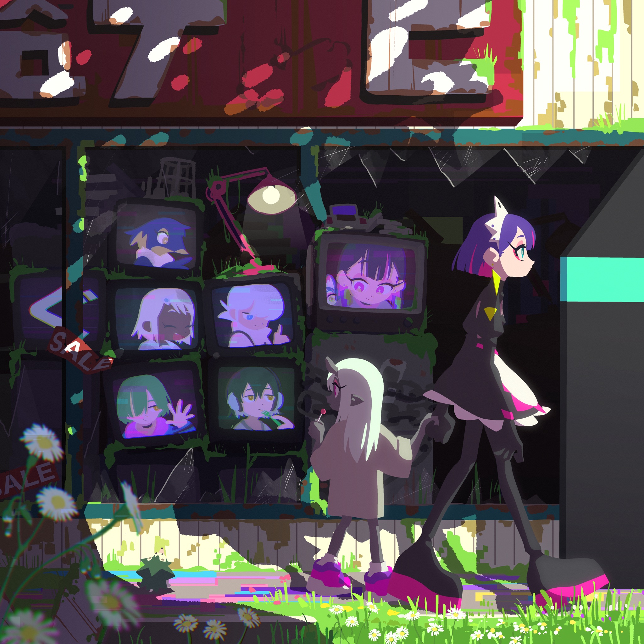 2girls android apron blue_hair colored_inner_hair colored_skin demon_girl demon_horns earrings fastening_(zutomayo) green_eyes grey_shirt grey_skin hanabushi highres horns jewelry kangurei_(zutomayo) kuraku_kuroku_(zutomayo) lamp maid maid_apron maid_headdress milabo_(zutomayo) multicolored_hair multiple_girls mune_no_kemuri_(zutomayo) nanashi_(zutomayo) nira-chan nira-chan_(kangurei)_(zutomayo) nira-chan_(kuraku_kuroku)_(zutomayo) nira-chan_(milabo)_(zutomayo) nira-chan_(mune_no_kemuri)_(zutomayo) nira-chan_(obenkyou_shitoiteyo)_(zutomayo) nira-chan_(tadashiku_narenai)_(zutomayo) obenkyou_shitoiteyo pink_eyes pink_hair pink_shoes pointy_ears robota_(zutomayo) shirt shoes socks streaked_hair tadashiku_narenai_(zutomayo) teiketsu_(fastening)_(zutomayo) teiketsu_(zutomayo) television triangle_earrings two-tone_hair white_hair white_socks wide_sleeves zutto_mayonaka_de_ii_no_ni