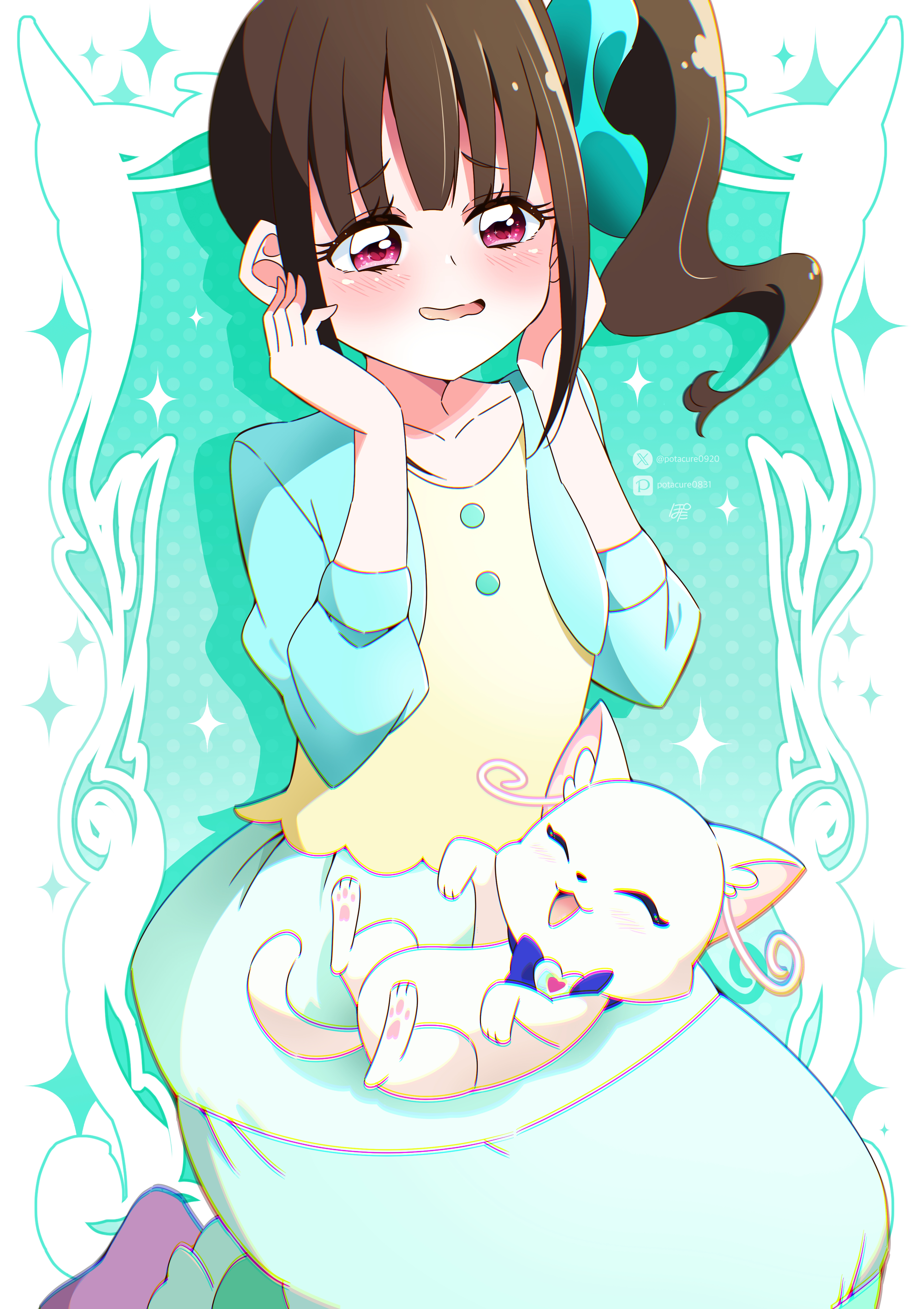 2girls :3 absurdres aqua_jacket aqua_scrunchie blue_bow blue_bowtie blush bow bowtie brown_hair cat closed_eyes highres jacket long_sleeves medium_hair multicolored_skirt multiple_girls nekoyashiki_mayu nekoyashiki_yuki nekoyashiki_yuki_(cat) open_clothes open_jacket open_mouth pink_eyes pixiv_username pota_(potacure1011) precure purple_socks scrunchie shirt side_ponytail signature skirt socks twitter_username wonderful_precure! yellow_shirt