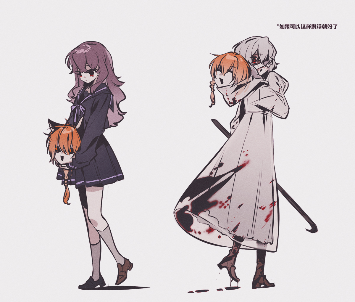 1boy 1girl animal_ears black_sclera black_serafuku blood blood_on_clothes cat_ears chinese_commentary chinese_text colored_sclera commentary_request crowbar fake_animal_ears grey_background grey_hair adashino_adami holding holding_crowbar holding_detached_head homicipher long_hair looking_at_viewer mr._chopped multiple_views orange_eyes orange_hair owenun red_eyes school_uniform serafuku severed_head simple_background skirt translation_request walking