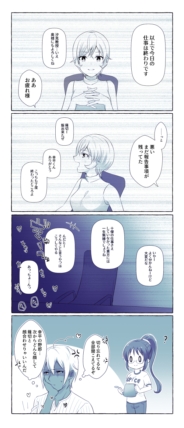 1boy 2girls ahoge anger_vein breasts chair hair_ornament hair_scrunchie hayama_akira heart highres large_breasts multiple_girls nakiri_erina ponytail scrunchie shiomi_jun shokugeki_no_souma short_hair short_sleeves smile speech_bubble teeth thought_bubble toy-black translation_request