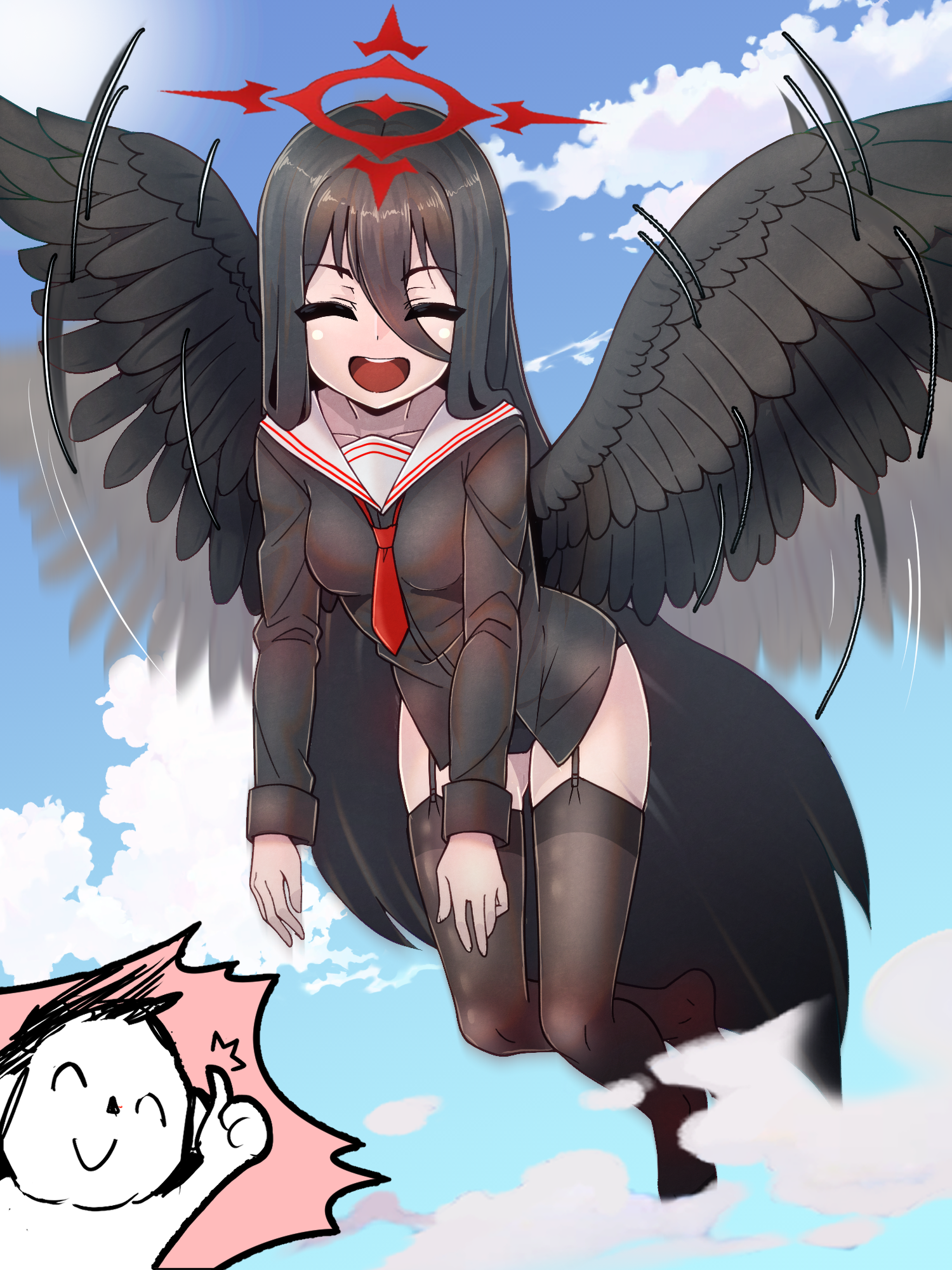 aged_down alternate_breast_size arms_at_sides black_garter_belt black_garter_straps black_hair black_panties black_serafuku black_shirt black_thighhighs blue_archive blue_sky breasts closed_eyes cloud collarbone doodle_sensei_(blue_archive) feathered_wings flapping flying garter_belt garter_straps hair_between_eyes halo happy hasumi_(blue_archive) highres oversized_wings long_hair long_hair_between_eyes long_sleeves mole mole_under_eye necktie nikrop no_pants no_shoes open_mouth outdoors panties red_halo red_necktie round_teeth sailor_collar school_uniform sensei_(blue_archive) serafuku shirt short_necktie sky sleeve_cuffs small_breasts smile teeth thighhighs thumbs_up underwear very_long_hair white_sailor_collar wings
