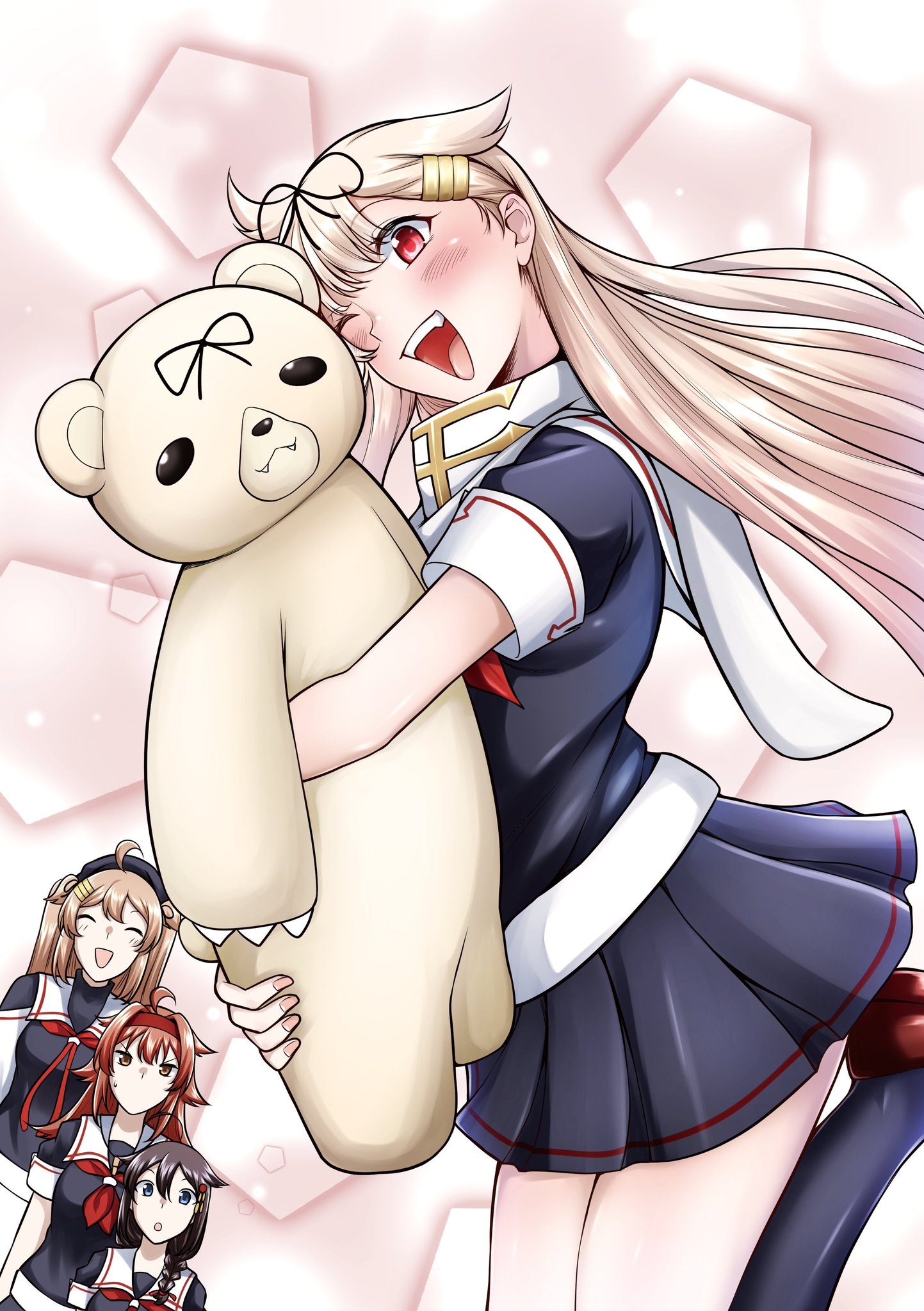 4girls beret black_hat black_serafuku black_shirt black_skirt blonde_hair hat highres hugging_doll hugging_object kantai_collection lens_flare long_hair multiple_girls murasame_(kancolle) murasame_kai_ni_(kancolle) neckerchief open_mouth pleated_skirt red_eyes red_neckerchief rikkii_(likito_yuzu_is) sailor_collar scarf school_uniform serafuku shigure_(kancolle) shigure_kai_ni_(kancolle) shiratsuyu_(kancolle) shiratsuyu_kai_ni_(kancolle) shirt skirt smile solo_focus stuffed_animal stuffed_toy teddy_bear teeth upper_teeth_only white_sailor_collar white_scarf yuudachi_(kancolle) yuudachi_kai_ni_(kancolle)