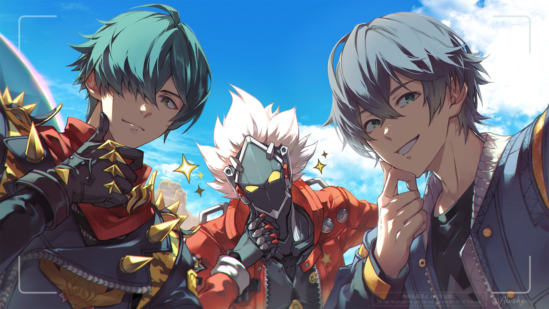 3boys aketohgo animal_print billy_kid black_jacket blue_jacket blue_sky cyborg green_eyes green_hair grey_hair grin hair_over_one_eye hand_on_own_cheek hand_on_own_chin hand_on_own_face highres humanoid_robot jacket leather leather_jacket lighter_(zenless_zone_zero) long_sleeves multiple_boys red_jacket red_scarf robot scarf shoulder_spikes sky smile sparkle spiked_hair spiked_jacket spikes studded_gloves tiger_print twitter_username viewfinder watermark white_hair wise_(zenless_zone_zero) zenless_zone_zero