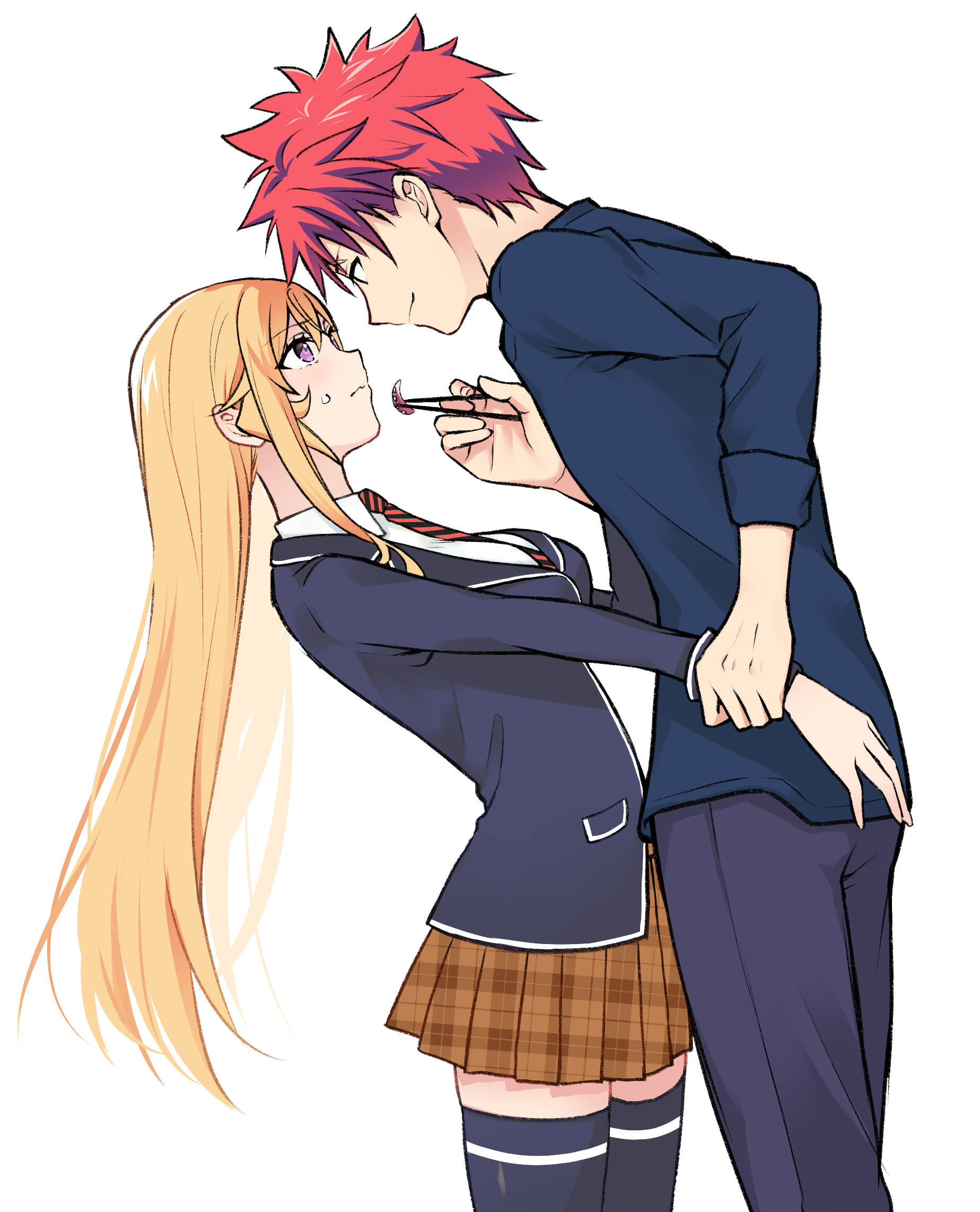 1boy 1girl black_jacket black_pants black_shirt black_thighhighs blonde_hair blush breasts brown_skirt chopsticks closed_mouth collared_shirt cowboy_shot from_side highres holding holding_another's_wrist holding_chopsticks jacket large_breasts long_hair nakiri_erina pants pleated_skirt purple_eyes shirt shokugeki_no_souma short_hair simple_background skirt smile thighhighs tootsuki_saryou_ryouri_gakuen_uniform toy-black white_shirt yukihira_souma