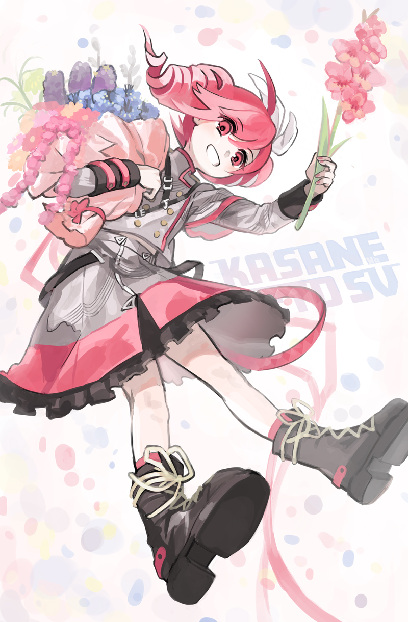 1girl ahoge belt black_belt black_boots blue_flower blue_petals boots bouquet bow buttons double-breasted double-parted_bangs drill_hair flat_chest flower green_flower grey_jacket grey_skirt grin hair_between_eyes hair_bow highres holding holding_bouquet jacket k_(yy4919) kasane_teto kasane_teto_(sv) knee_boots kneehighs lace-up_boots layered_skirt long_sleeves looking_at_viewer midriff_peek petals pink_flower platform_boots platform_footwear red_belt red_eyes red_flower red_hair red_petals red_skirt red_socks red_trim shoulder_belt simple_background skirt smile socks solo striped_clothes striped_jacket synthesizer_v three-quarter_sleeves twin_drills utau white_background white_bow yellow_petals
