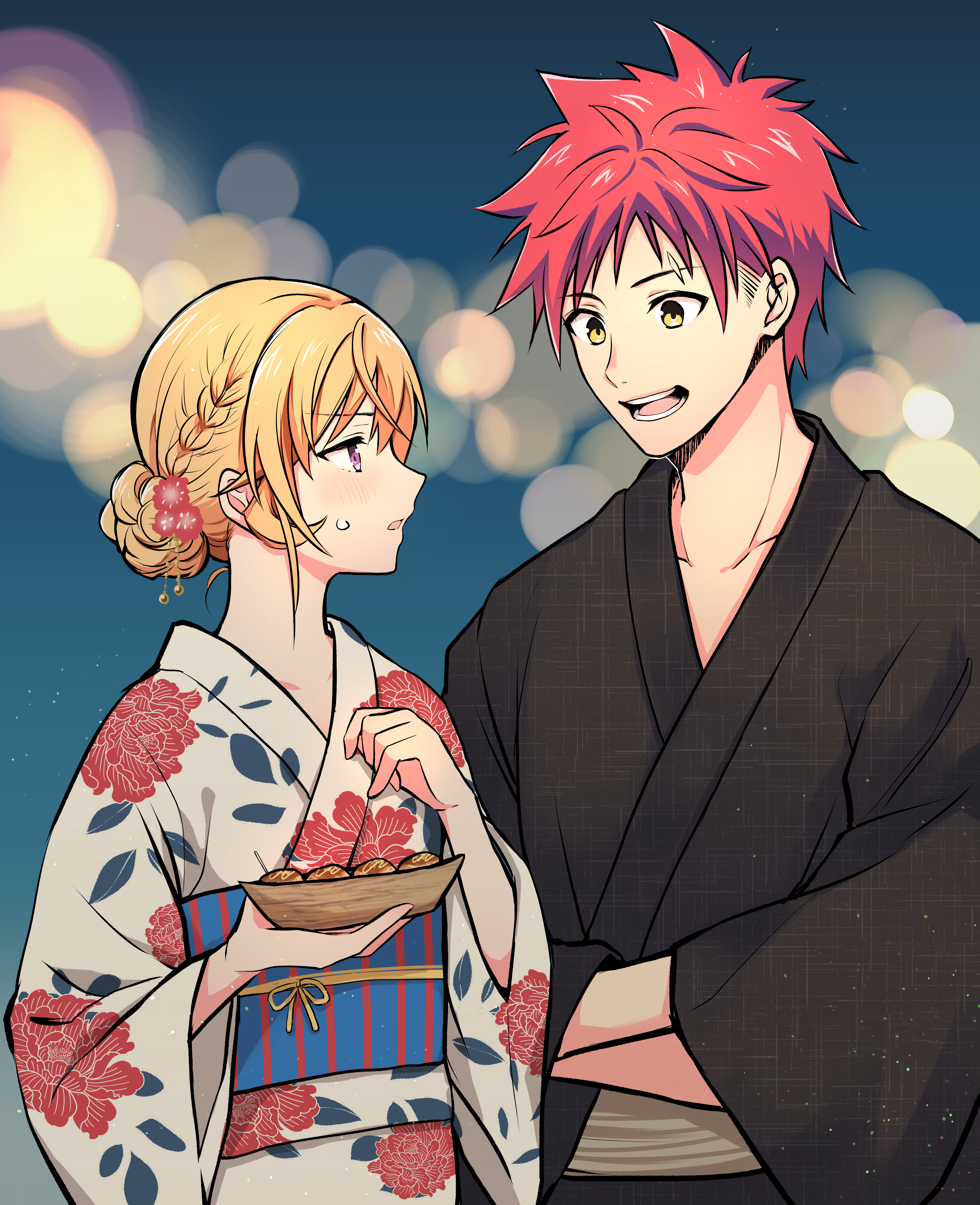 1boy 1girl :d :o absurdres black_kimono blurry blurry_background bowl braid collarbone crossed_arms eye_contact floral_print floral_print_kimono hair_bun highres holding holding_bowl japanese_clothes kimono long_sleeves looking_at_another nakiri_erina obi open_mouth print_kimono red_hair sash scar_across_eyebrow scar_on_face shokugeki_no_souma short_hair single_hair_bun smile sweatdrop teeth tongue toy-black upper_body wide_sleeves yukihira_souma