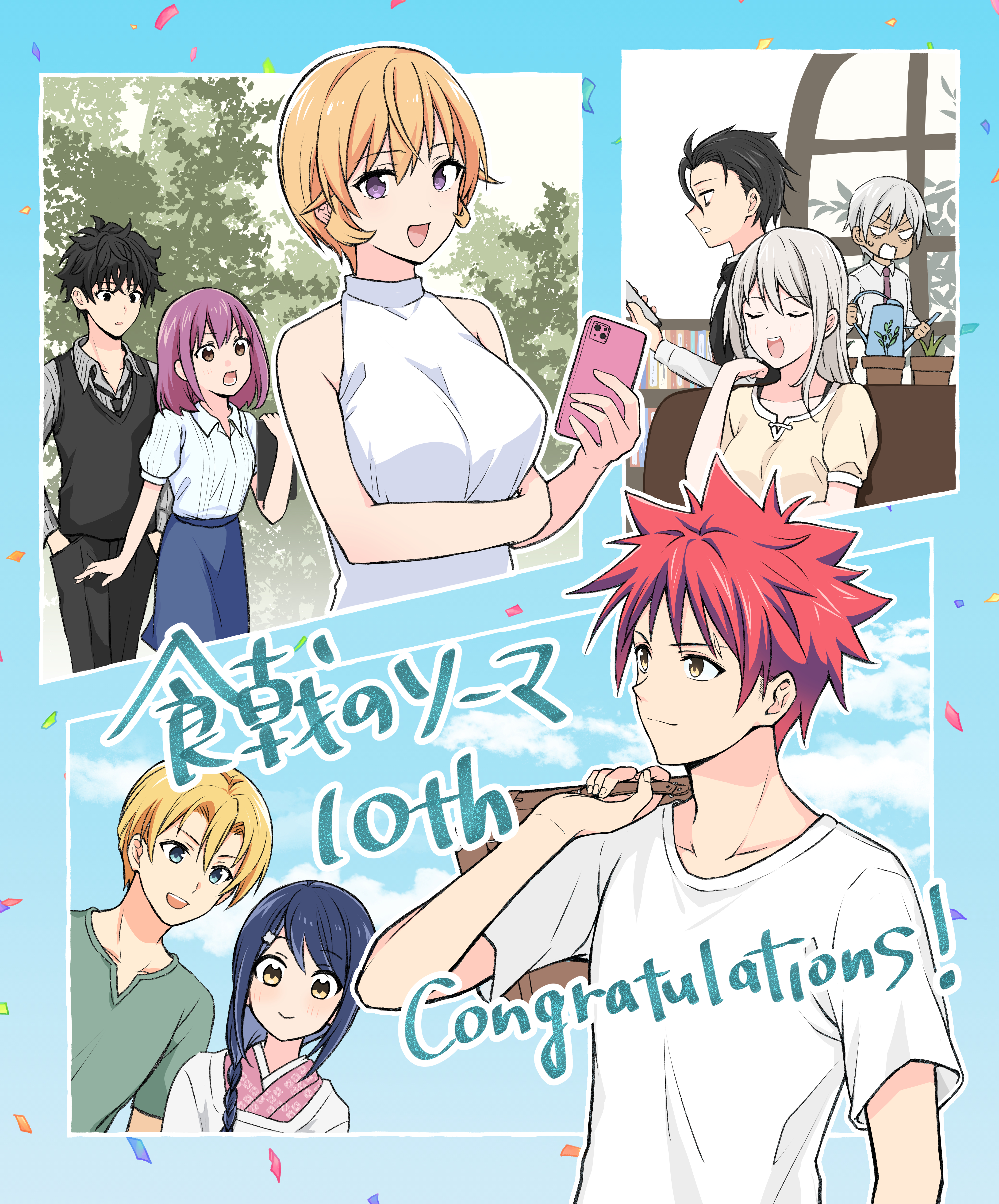 4girls 5boys :d absurdres angry arato_hisako bare_arms bare_shoulders black_hair black_necktie black_skirt black_vest blonde_hair breasts cloud collared_shirt congratulations day desk hayama_akira highres holding holding_phone kurokiba_ryou large_breasts long_hair multiple_boys multiple_girls nakiri_alice nakiri_asahi nakiri_erina necktie open_mouth outdoors phone plant potted_plant red_hair shirt shirt_tucked_in shokugeki_no_souma short_hair short_sleeves skirt smile striped_clothes striped_shirt tadokoro_megumi takumi_aldini toy-black translation_request vest white_hair yellow_shirt yukihira_souma