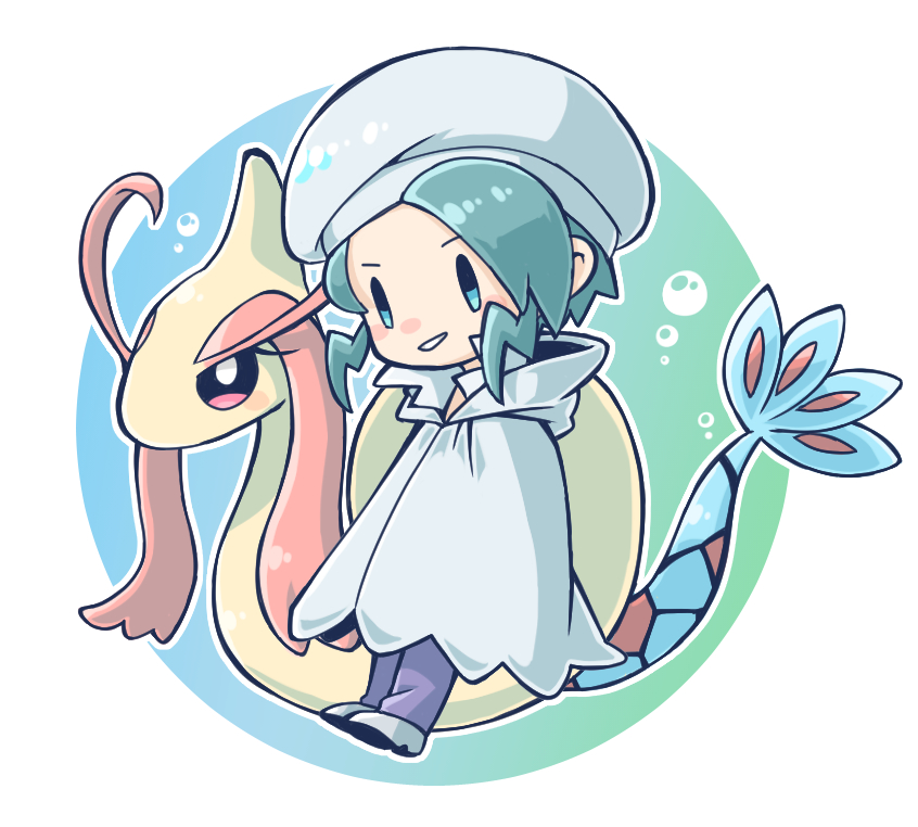 1boy aqua_hair chibi cloak commentary_request full_body gen_3_pokemon hat high_collar male_focus matsumo_(matsumo_ji) milotic nintendo pants pokemon pokemon_(creature) pokemon_emerald pokemon_ruby/sapphire/emerald purple_pants wallace_(pokemon)