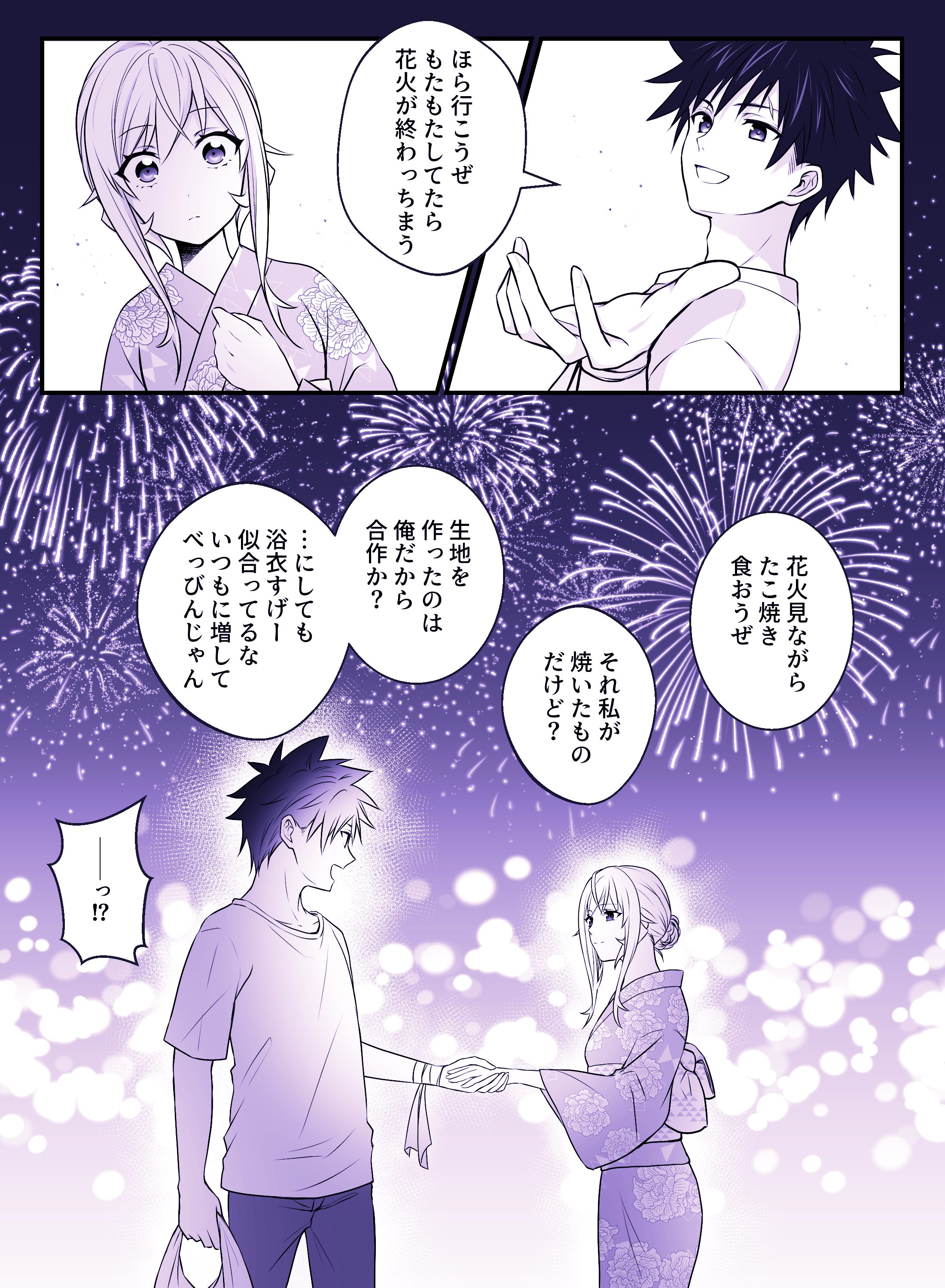 1boy 1girl :d absurdres aerial_fireworks bag eye_contact fireworks floral_print floral_print_kimono hand_up highres holding holding_bag holding_hands looking_at_another nakiri_erina open_mouth pants print_kimono shirt shokugeki_no_souma short_hair short_sleeves smile speech_bubble spiked_hair toy-black translation_request yukihira_souma