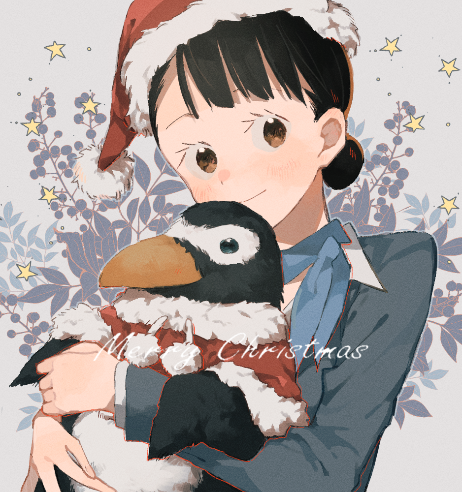 1girl akino_(concierge) black_hair brown_eyes grey_shirt hat hokkyoku_hyakkaten_no_concierge-san holding holding_stuffed_toy merry_christmas santa_hat shirt solo sora_mame_(7799374) stuffed_animal stuffed_penguin stuffed_toy upper_body