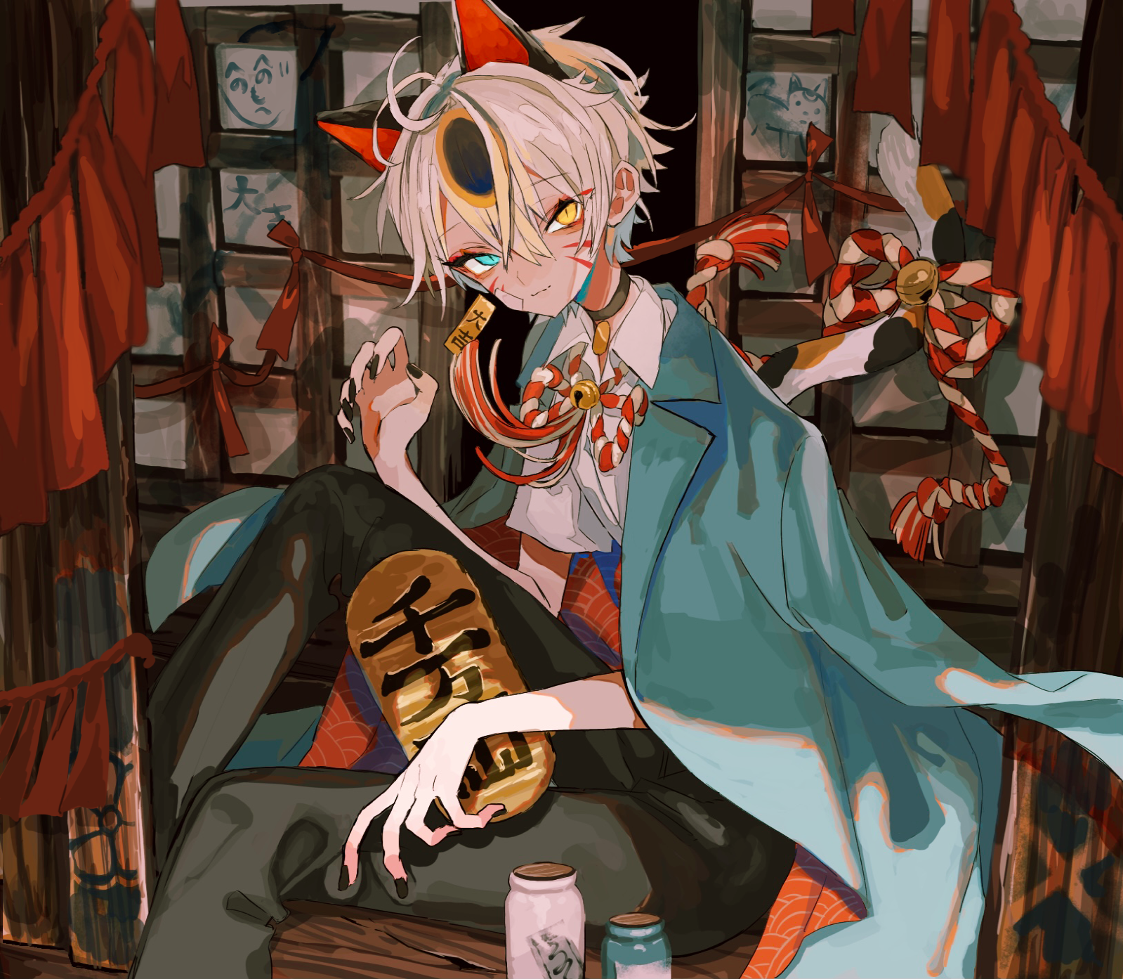 1boy aqua_coat architecture bandaid bandaid_on_cheek bandaid_on_face bell black_choker black_nails black_pants blue_eyes borrowed_character bow box calico_(pattern) cat_boy cat_tail choker closed_mouth coat coat_on_shoulders collared_shirt commission double-parted_bangs earrings east_asian_architecture eyeliner facial_mark feet_out_of_frame floating_earrings hair_between_eyes hand_up heterochromia highres jewelry jingle_bell light_smile makeup male_focus multicolored_tail nail_polish neck_bell omatsu_99 on_box open_clothes open_coat original pants pendant_choker red_eyeliner second-party_source shadow shirt short_hair short_sleeves single_earring sitting skeb_commission slit_pupils solo spotted_hair tail tail_bell tail_bow tail_ornament tsurime whisker_markings white_hair white_shirt wing_collar yellow_eyes
