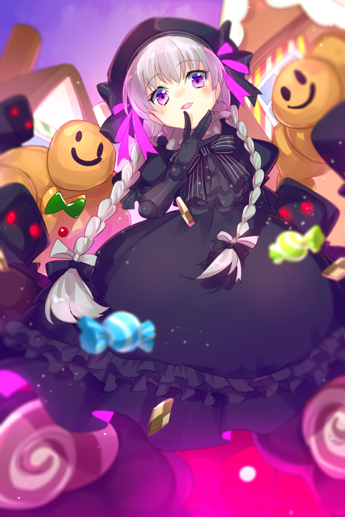 1girl beret black_dress black_hat blush braid breasts candy doll_joints dress echo_(circa) fate/grand_order fate_(series) food frills golem grey_hair hat joints lollipop long_hair looking_at_viewer nursery_rhyme_(fate) open_mouth puffy_short_sleeves puffy_sleeves purple_eyes short_sleeves small_breasts smile twin_braids