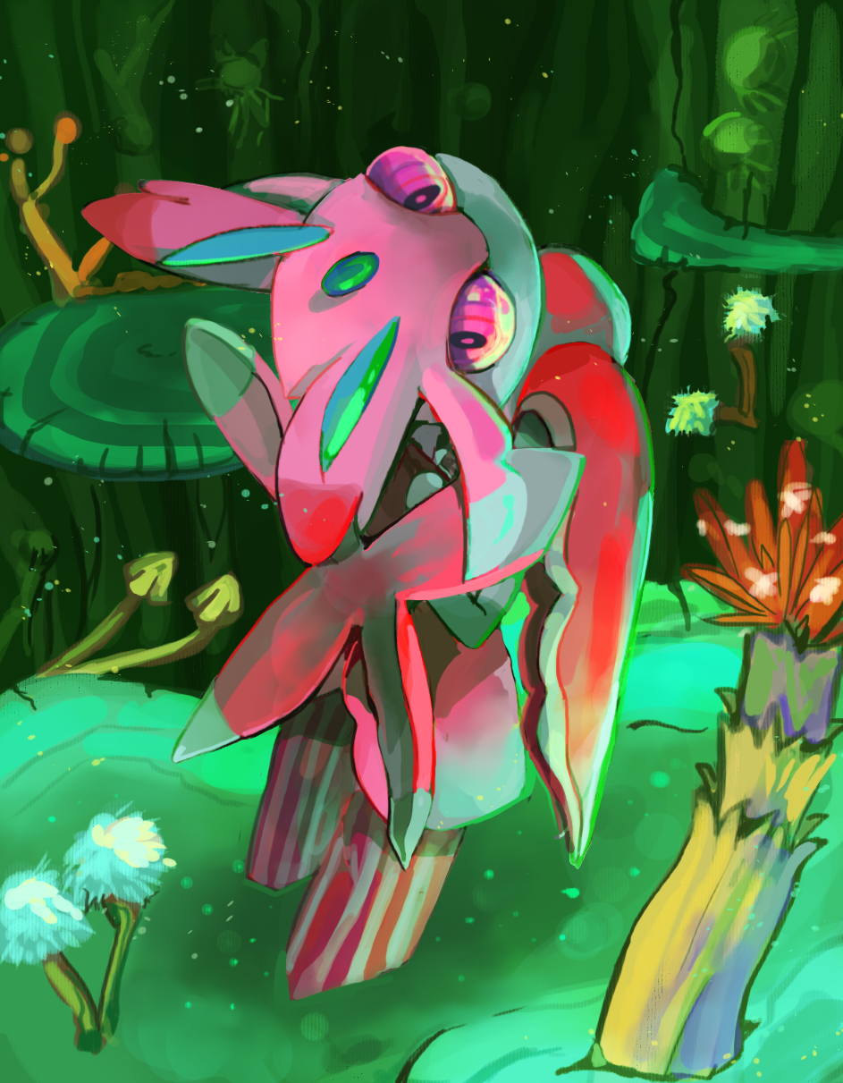 1girl ani_(puniper) antennae arthropod_girl arthropod_limbs colored_skin full_body furry furry_female gen_7_pokemon highres looking_at_viewer looking_up lurantis mantis_girl nintendo outdoors pink_eyes pink_skin pokemon pokemon_(creature) praying_mantis solo standing white_skin