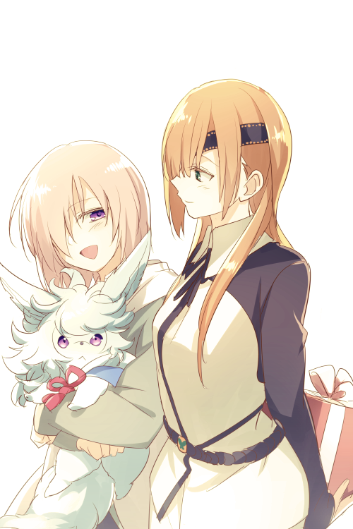 2girls arms_behind_back backlighting blush brown_hair echo_(circa) eyepatch fate/grand_order fate_(series) fou_(fate) gift hair_over_one_eye hug long_hair long_sleeves mash_kyrielight multiple_girls one_eye_closed open_mouth ophelia_phamrsolone pink_hair purple_eyes short_hair smile white_background