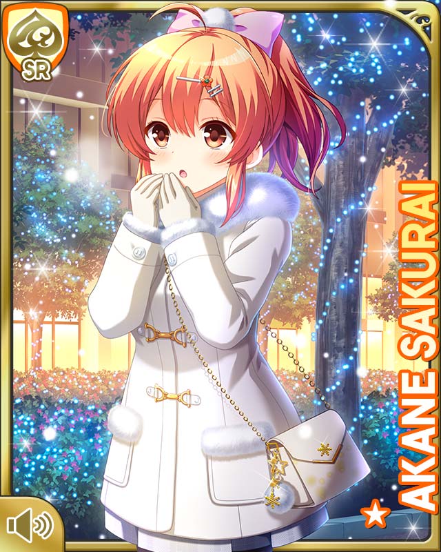 1girl :o bag black_socks bow brown_eyes brown_hair card_(medium) coat dress fur_trim girlfriend_(kari) gloves grey_dress hair_ornament handbag hands_by_face looking_at_viewer night official_art open_mouth outdoors pink_bow ponytail qp:flapper sakurai_akane_(girlfriend_(kari)) snow snowing socks standing tree white_coat white_gloves winter_clothes