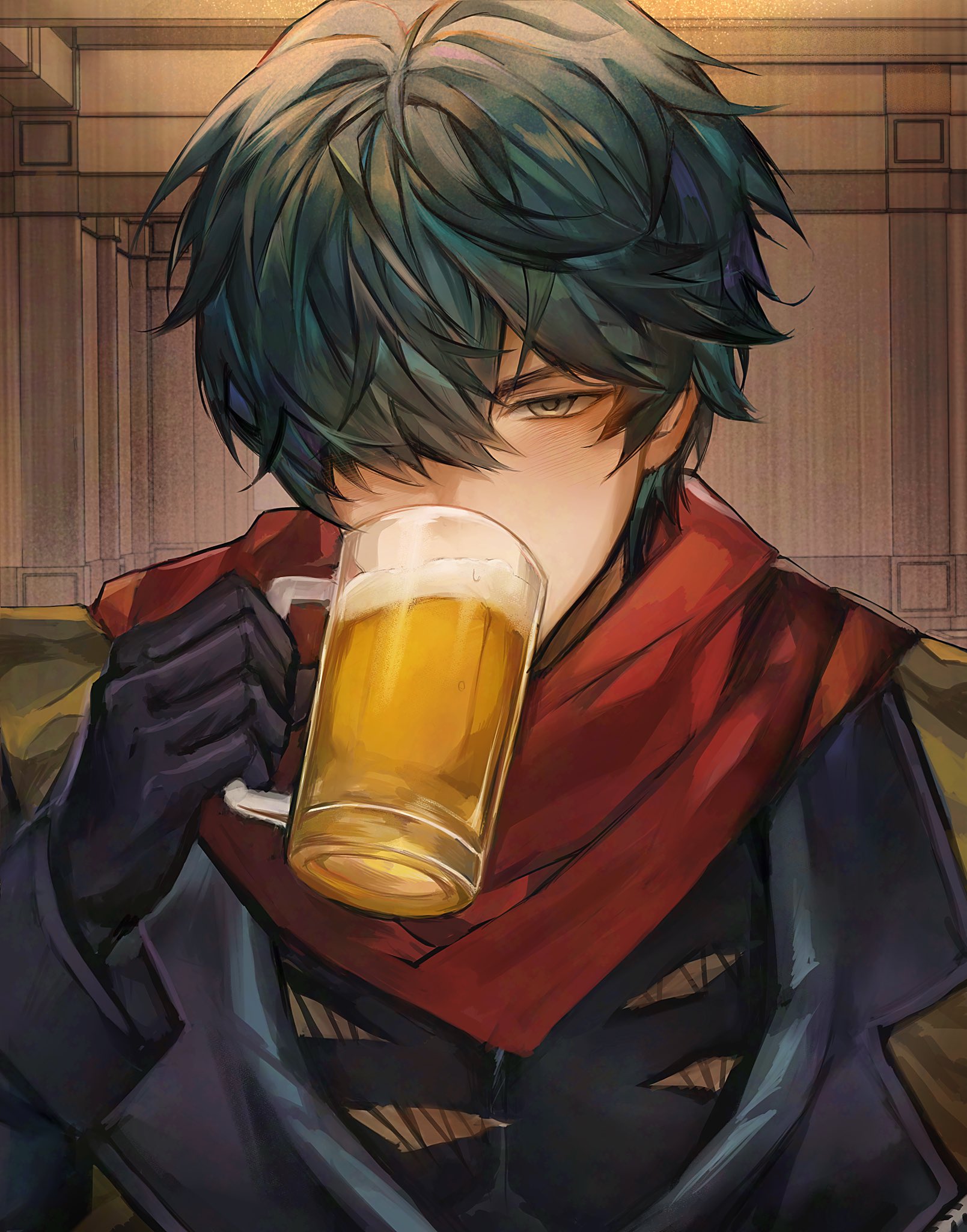 1boy alcohol beer beer_mug black_gloves black_jacket black_shirt blue_hair blush commentary cup drinking gloves green_eyes hair_over_one_eye hand_up highres holding holding_cup indoors jacket lapels lighter_(zenless_zone_zero) long_sleeves looking_at_viewer male_focus mug one_eye_covered parted_bangs red_scarf scarf shirt short_hair solo untranslatable_commentary tappeee torn_clothes torn_shirt upper_body zenless_zone_zero