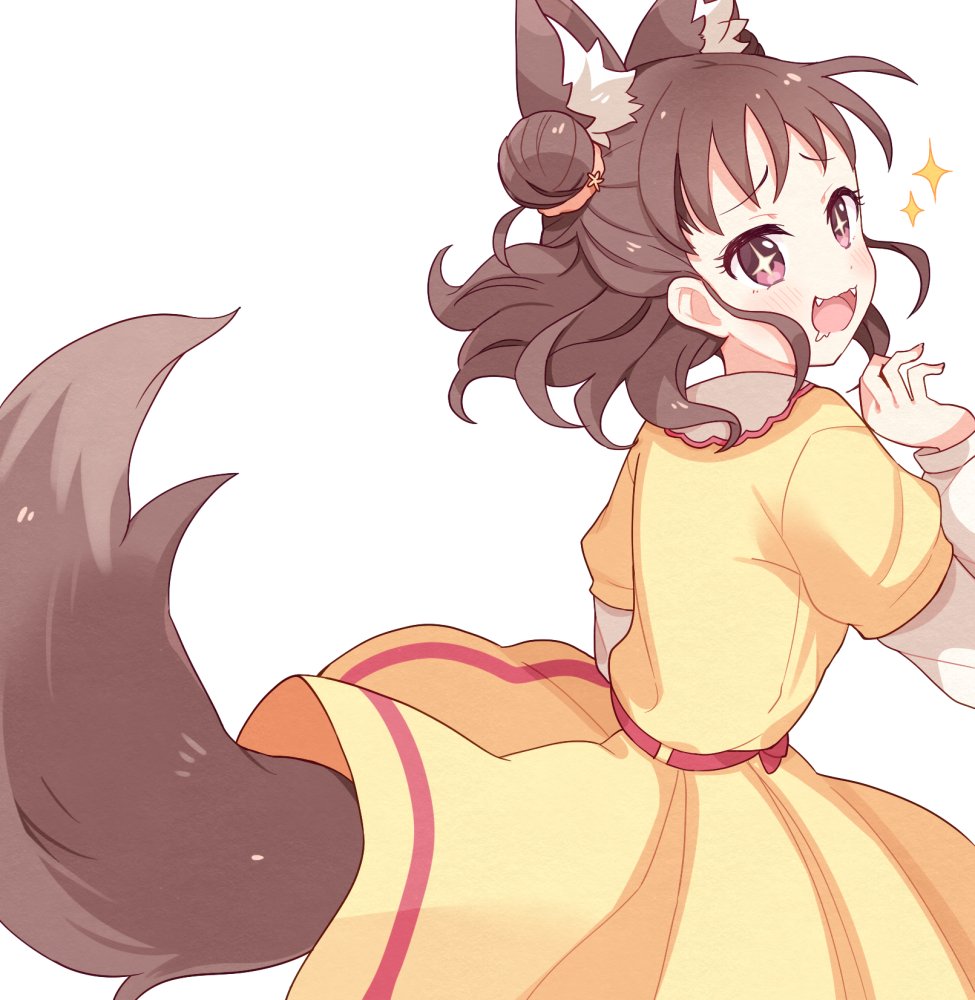 +_+ 1girl animal_ear_fluff animal_ears brown_hair double_bun dress drooling fangs from_behind hair_bun hand_up long_hair looking_at_viewer open_mouth original pink_eyes shirt simple_background smile solo sparkle suzuno_(suzuno3110) tail white_background white_shirt yellow_dress