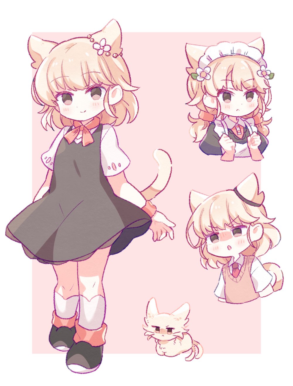 1girl animal_ears apron black_dress black_footwear blonde_hair border bow brown_eyes cat_ears cat_girl cat_tail choker dress flower hair_flower hair_ornament highres maid_apron maid_headdress medium_hair multiple_views nekomata original pink_background puffy_sleeves red_bow ribbon_choker shirt shoes short_sleeves socks suzuno_(suzuno3110) sweater_vest tail white_border white_shirt white_socks yellow_sweater_vest