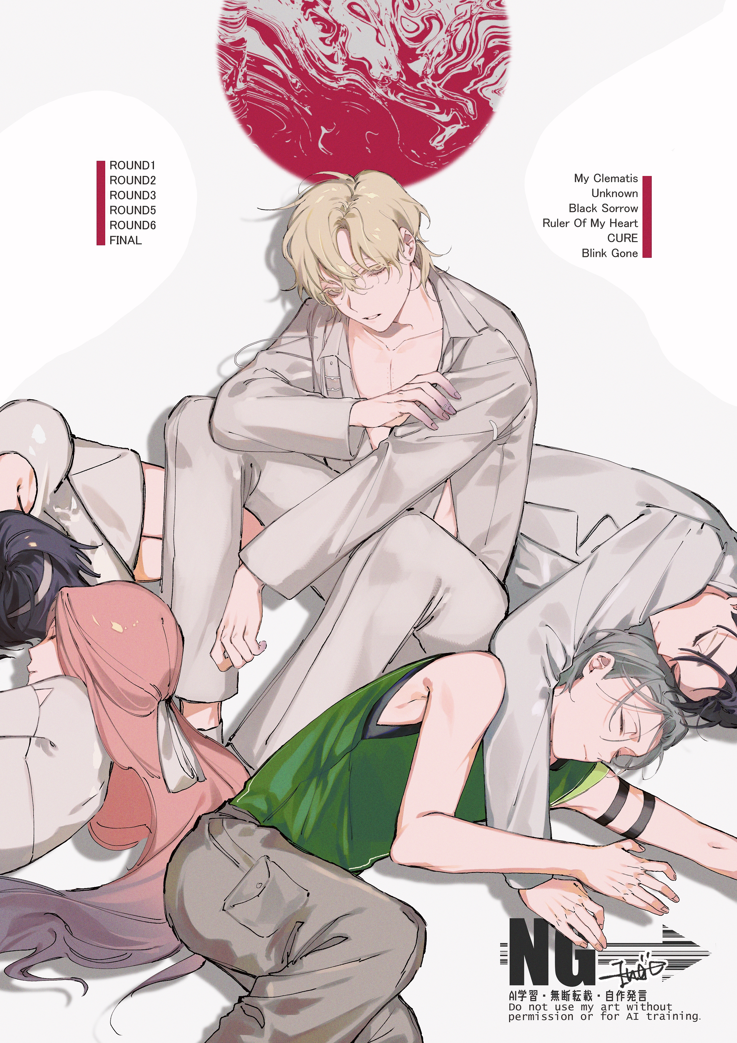 01tiyk 2girls 3boys absurdres alien_stage armband black_hair blonde_hair closed_eyes coat colored_extremities colored_eyelashes commentary_request dress english_text gradient_hair green_tank_top grey_hair grey_pants hair_ribbon half_updo highres ivan_(alien_stage) knees_up long_sleeves looking_at_viewer luka_(alien_stage) lying mizi_(alien_stage) multicolored_hair multiple_boys multiple_girls on_side pants pink_hair ribbon shirt short_hair simple_background sitting song_name sua_(alien_stage) tank_top till_(alien_stage) two-tone_hair very_short_hair white_background white_coat white_dress white_pants white_ribbon white_shirt yellow_eyes
