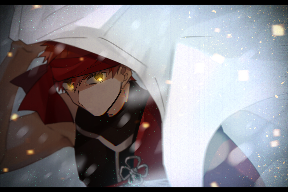 1boy cloak emiya_shirou emiya_shirou_(archer_install)_(prisma_illya) emiya_shirou_(prisma_illya) expressionless fate/grand_order fate/kaleid_liner_prisma_illya fate_(series) film_grain headband letterboxed male_focus misuko_(sbelolt) orange_hair red_headband solo upper_body white_cloak yellow_eyes