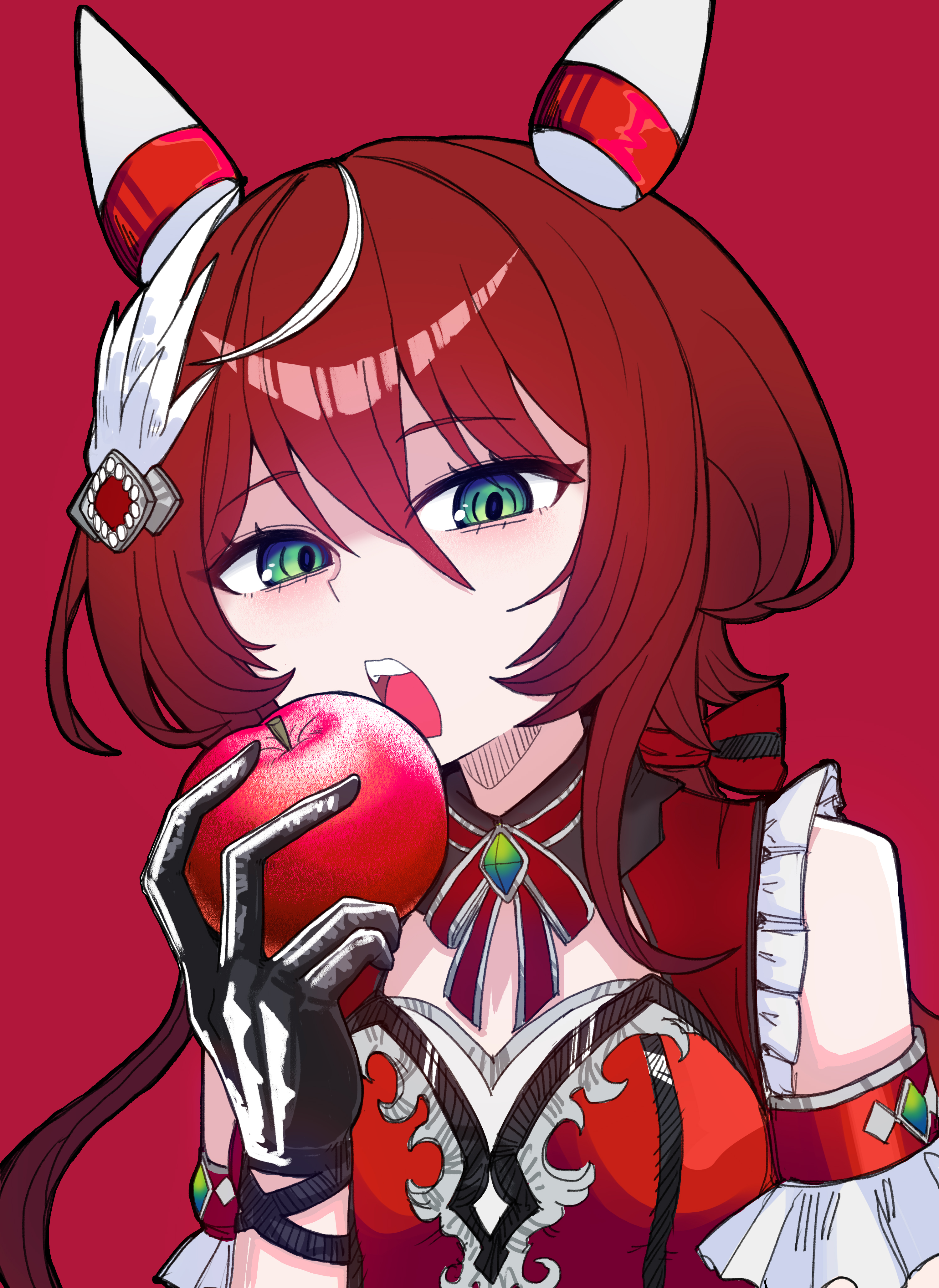 1girl absurdres animal_ears apple breasts eating food fruit gloves green_eyes hair_between_eyes hair_ornament highres horse_ears horse_girl koshou_shou_mitsu looking_at_viewer low_twintails portrait red_background red_hair simple_background sleeveless small_breasts solo twintails umamusume win_variation_(umamusume)
