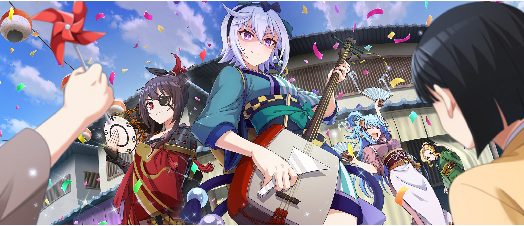 4girls apron aqua_(konosuba) aqua_kimono architecture black_hairband blonde_hair blue_hair blue_sky bow bow_hairband brown_hair chris_(konosuba) closed_eyes cloud cloudy_sky confetti day drum east_asian_architecture edo_jidai evil_smile eyepatch facial_scar flower folded_ponytail from_below game_cg glowing glowing_eyes green_kimono grey_hair hair_between_eyes hair_bow hair_bun hair_flower hair_ornament hair_rings hair_stick hairband hand_fan highres holding holding_instrument instrument japanese_clothes kimono kono_subarashii_sekai_ni_shukufuku_wo! konosuba!_fantastic_days light_blue_hair long_hair looking_at_viewer looking_down luna_(konosuba) megumin multiple_girls music obi obijime official_alternate_costume official_alternate_hairstyle official_art open_mouth outdoors pink_kimono playing_instrument purple_eyes red_eyes red_kimono sash scar scar_on_cheek scar_on_face shaded_face shamisen short_hair short_hair_with_long_locks short_kimono side_ahoge sidelocks single_hair_bun single_hair_ring sky smile striped_clothes striped_kimono tokyo_(city) tsuzumi v-shaped_eyebrows vertical-striped_clothes vertical-striped_kimono waist_apron yellow_eyes