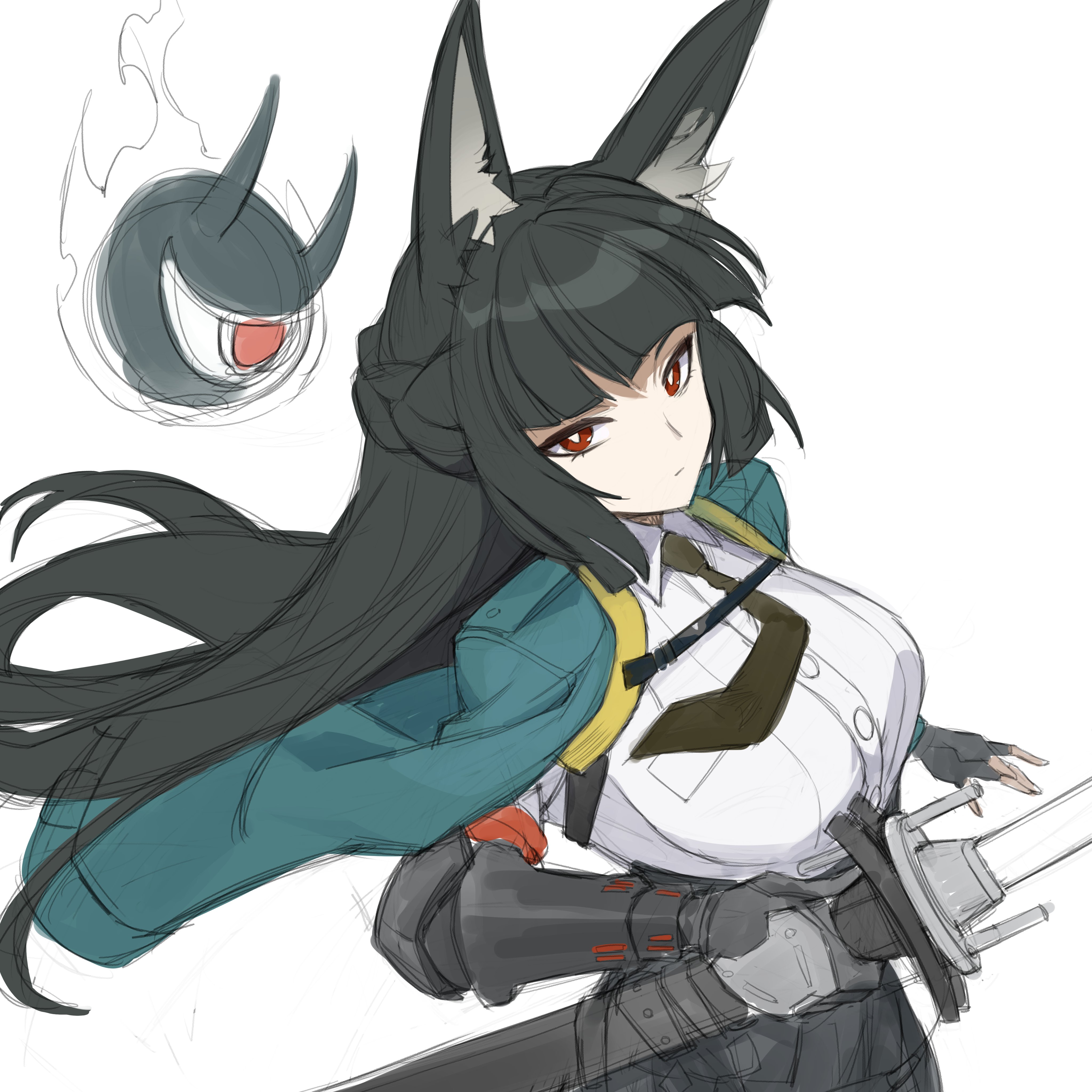 1girl absurdres animal_ears black_gloves black_hair black_necktie blunt_bangs closed_mouth expressionless fingerless_gloves fox_ears fox_girl gloves green_jacket highres holding holding_sword holding_weapon hoshimi_miyabi jacket long_hair looking_at_viewer necktie red_eyes shirt sidelocks simple_background solo sword upper_body weapon white_background white_shirt y_frt zenless_zone_zero