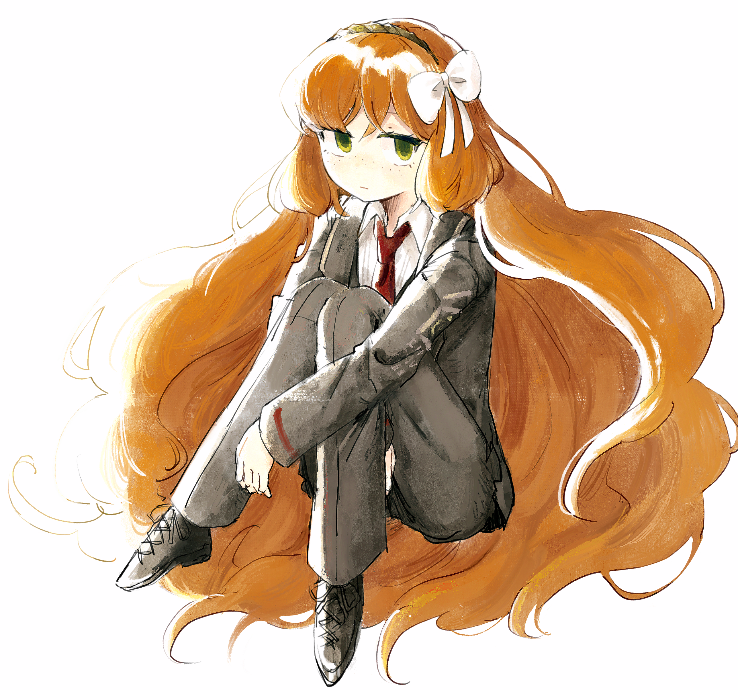 1girl absurdres black_footwear black_jacket black_pants bow collared_shirt freckles full_body green_eyes hair_bow hairband highres hoshizuki_sakusa ishmael_(project_moon) jacket knees_up lapels limbus_company looking_at_viewer necktie orange_hair pants parted_lips project_moon red_necktie shirt simple_background sitting sitting_on_hair solo white_background white_shirt