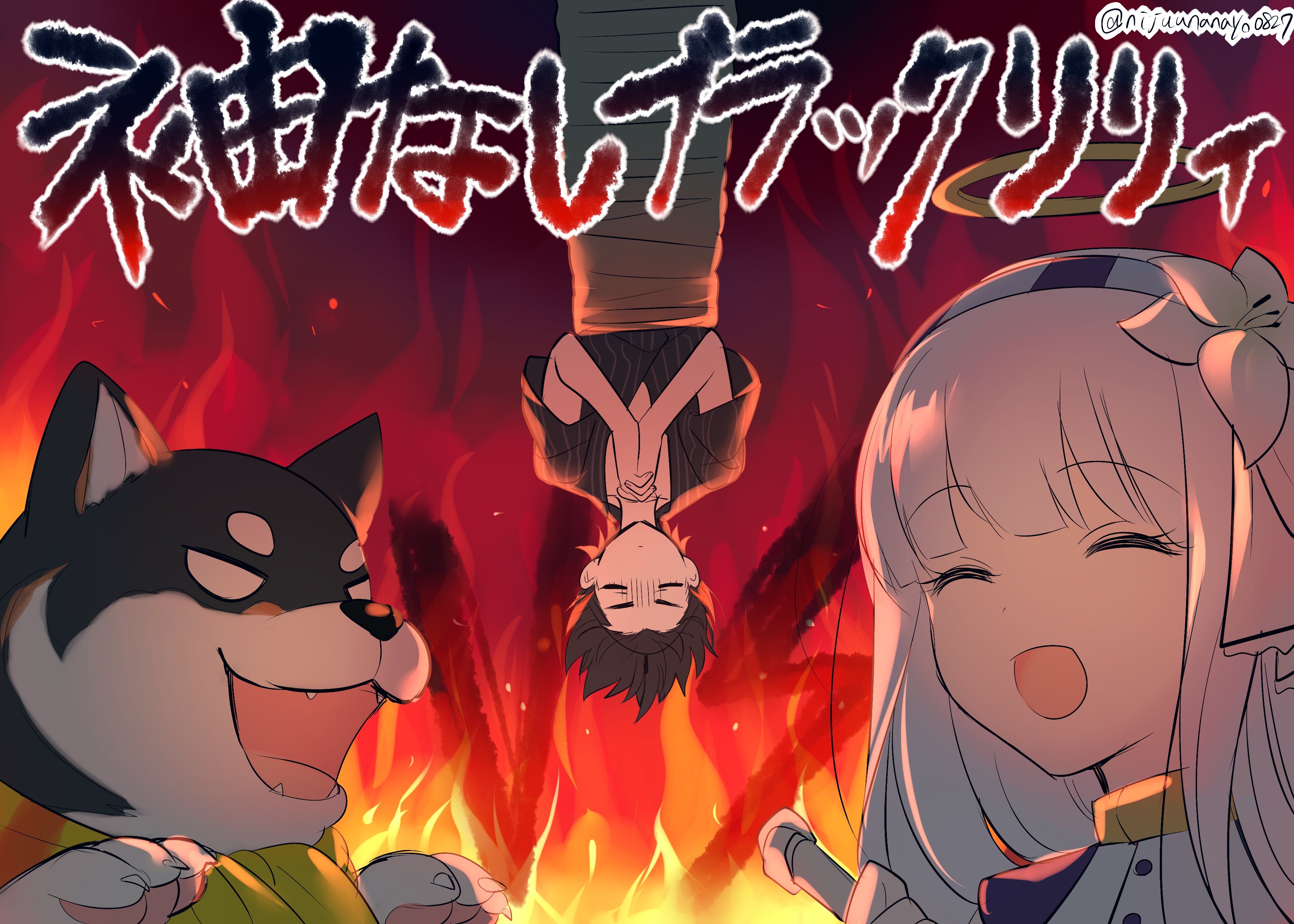 1boy 1girl :d ^_^ absurdres animal black_hair blue_hairband bone bound closed_eyes closed_mouth dog fangs fire flower hair_flower hair_ornament hairband hanging highres holding interlocked_fingers kuroi_shiba long_hair nijisanji ninahachi open_mouth own_hands_clasped own_hands_together shirayuri_lily smile thick_eyebrows tied_up_(nonsexual) translation_request turn_pale twitter_username upside-down v-shaped_eyes virtual_youtuber vivid_(production) white_flower white_hair yumeoi_kakeru