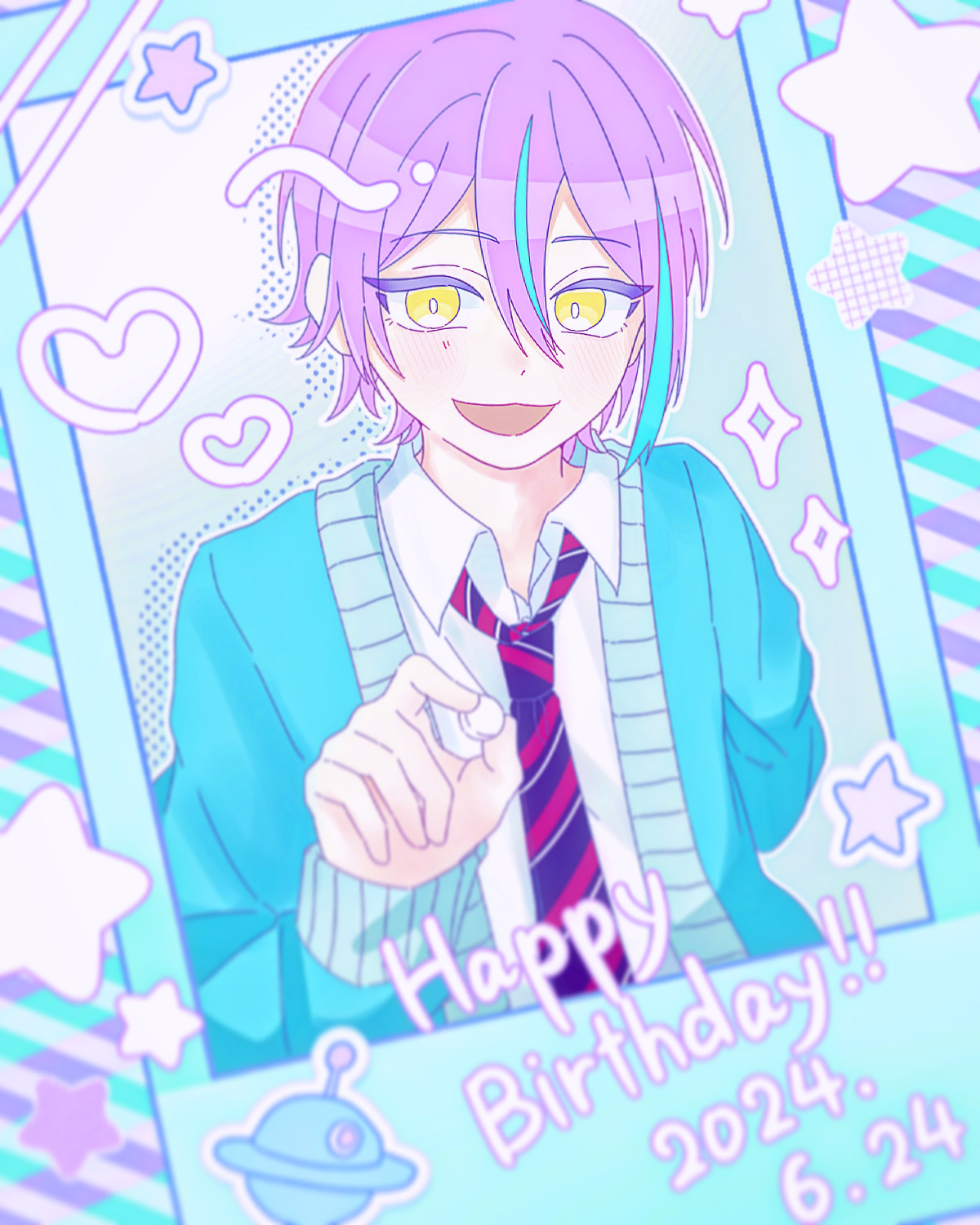 1boy blue_cardigan cardigan collared_shirt hair_between_eyes happy_birthday heart highres kamishiro_rui looking_at_viewer medium_hair multicolored_hair necktie picture_frame project_sekai purple_hair sakuragitune810 shirt smile star_(symbol) striped_clothes striped_necktie white_shirt yellow_eyes